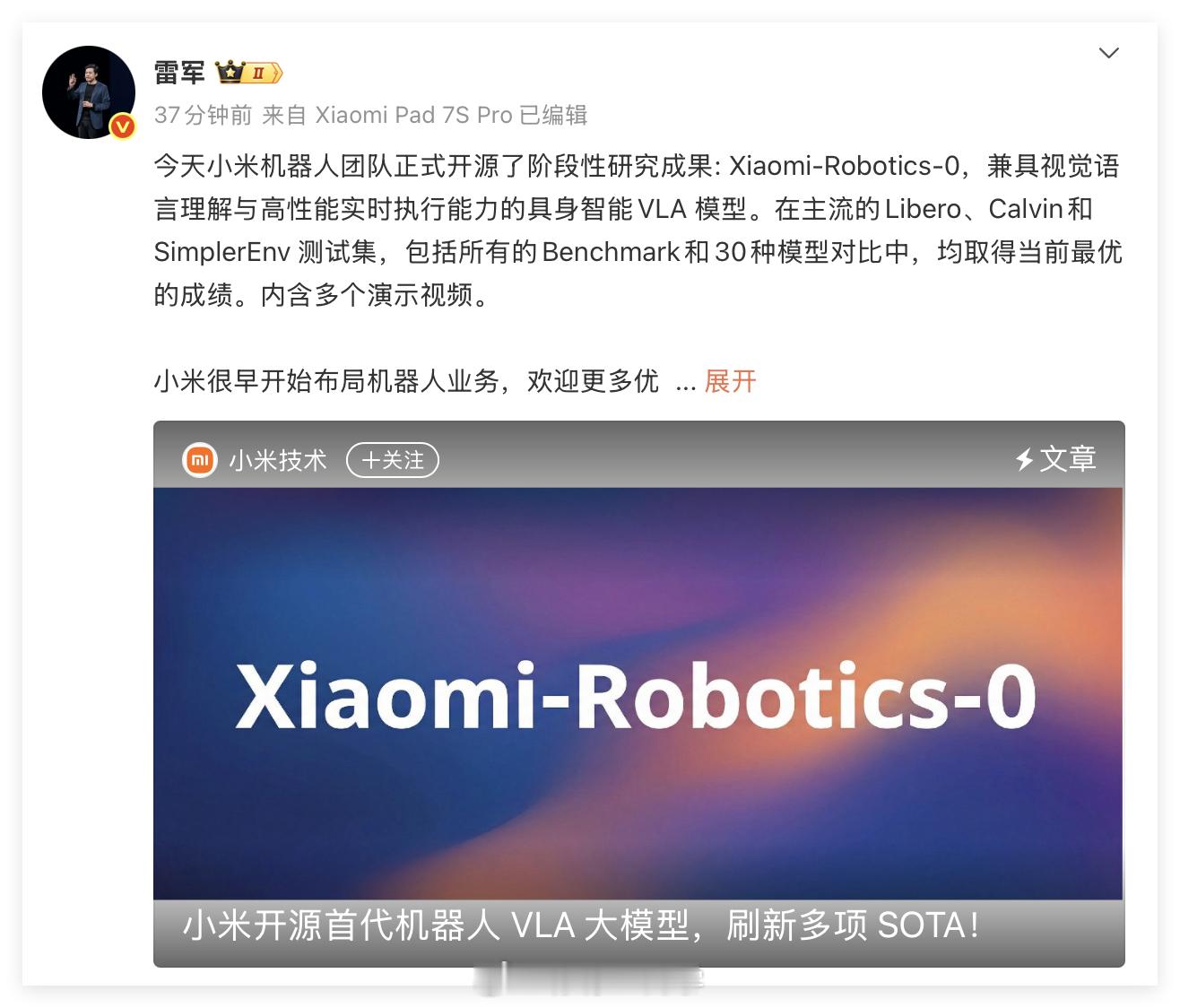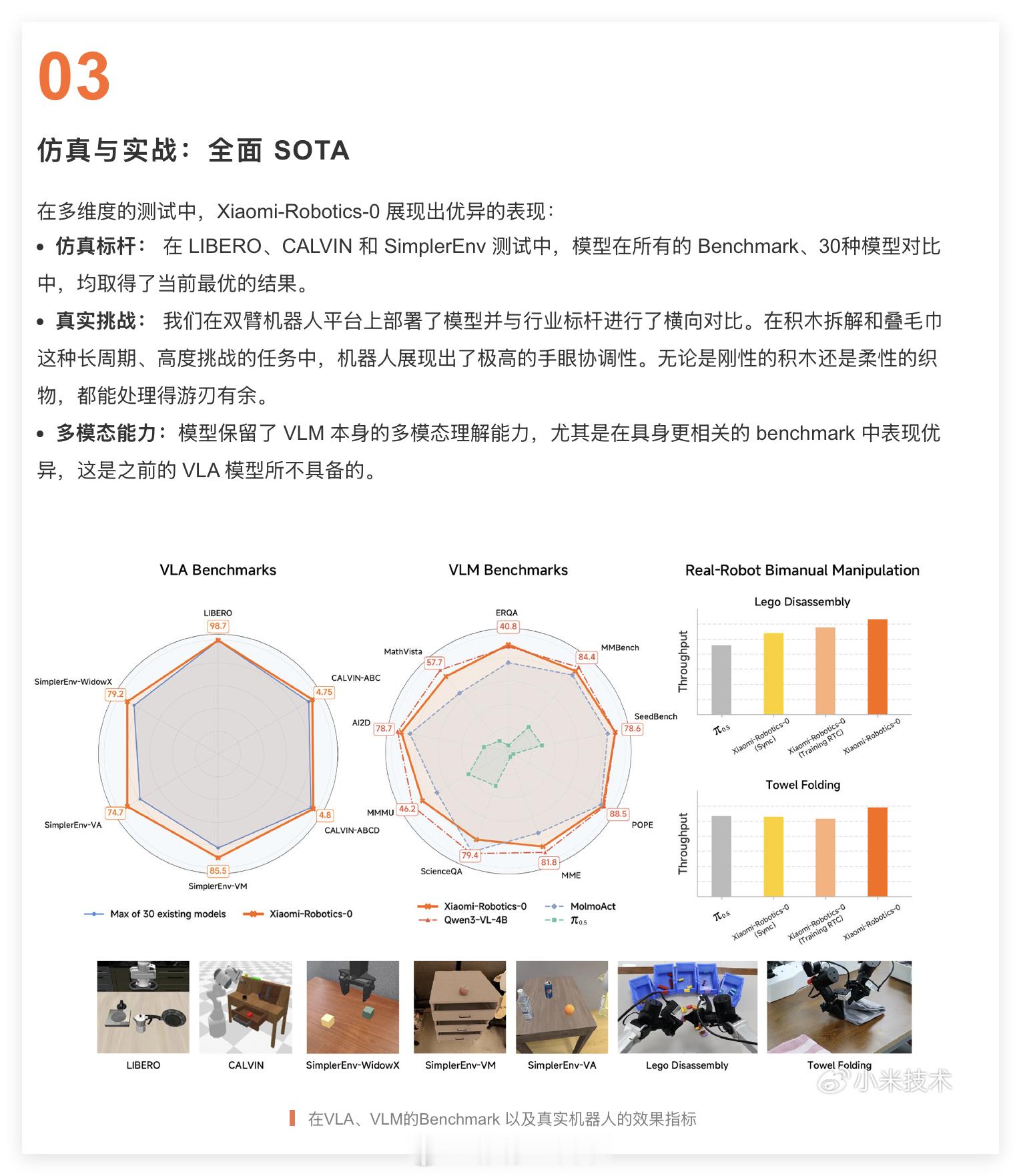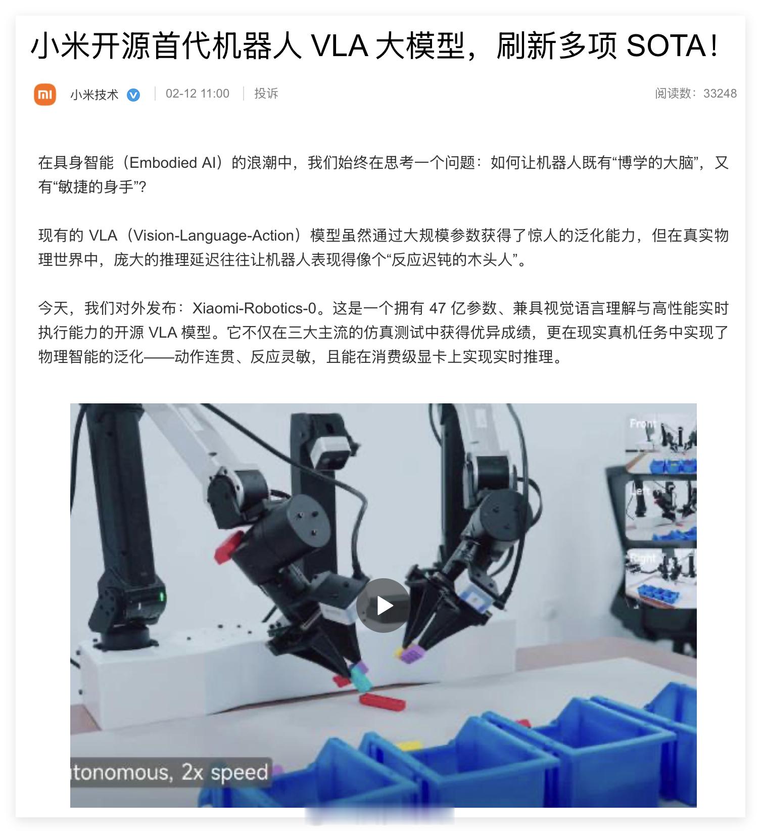 继Mimo-Flash刷新多模态推理效率后,小米今日正式开源其首代视觉-语言-动作(VLA)大模型 Xiaomi-Robotics-0,在LIBERO、CALVIN、RLBench三大权威仿真榜单上全面超越Meta的OpenVLA与Google DeepMind的Pi模型,稳居行业第一梯队。雷军公布小米机器人最新进展