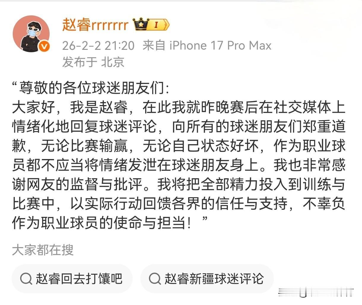 支持赵睿,说的没错!球迷没有错吗?人人都是平等的,赵睿毕竟为国家争过光,那些球迷除了浪费粮食还有什么贡献。