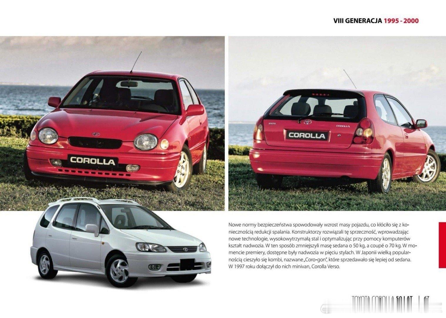丰田卡罗拉50年简史(1966–2016)(第四辑)从1966年诞生到2016年50周年,历经11代,全球累计销量超4400万辆,成为全球最畅销家用车,家用化成熟(1987–2000,第6–8代 E90–E110)• 第6代(1987–1992):全面前驱,造型圆润,配置升级• 第7代(1992–1995):尺寸更大,安全与舒适提升• 第8代(1995–2000):VVT-i发动机,油耗更低、更安静