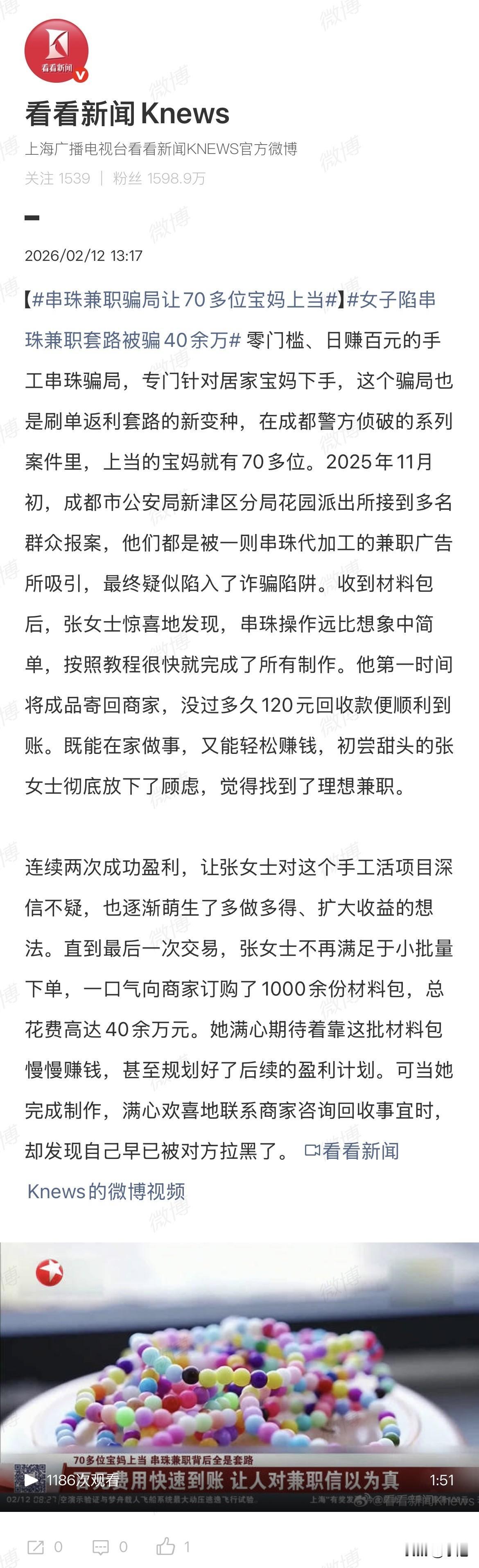 家人们谁懂啊,70多个宝妈在家串珠子,硬生生让人骗走了460万。 成都的张女士一开始就是想在宝妈群里找点事做。刷到一条广告:串珠材料包380一份,串完寄回去,他们420回收,一单净赚40。 她觉得这事靠谱,门槛低,不出门,还能带孩子。 第一次下单3份,花了1140。珠子寄过来,她照着视频教程串,比想象中还简单,没两天就弄完了。寄回去没几天,对方打过来120块手工费,连1140的本金也一分不少退回来了。 钱到账那一下,她心里踏实了。 第二次,她加了量,20多份材料包。寄回去,返款流程还是顺得很,这一次净赚800多。她跟自己说,这种好事怎么才遇上。 其实她不知道,这800多块不是工资,是鱼饵。 这时候群里还有别的宝妈晒单,有人说做了两个月赚了好几千,有人说全家老小一起上手当副业。张女士越看越坐不住。 第三次,她做了个决定。 1000多份材料包,一次订齐。40万,是她这些年省吃俭用攒下的全部。 东西堆了半个客厅,她一个人串不过来,叫上娘家妈,叫上妯娌,孩子睡了就串到后半夜。那一个多月她没怎么睡整觉,但心里是满的——这一单做完,赚的能顶上老公一年的工资。 等到所有珠子都串完,她拍照发给商家,问什么时候寄。 红色感叹号。 打电话,忙音。 换个号打,不接。 她蹲在客厅那堆串好的成品中间,从头到尾翻聊天记录,翻对方的店铺页面,翻那个宝妈群里发过单的人。店铺打不开了,群里的那个人也再没说过话。 报案之后她才知道,自己不是第一个,也不是最后一个。 云南、贵州、广西,70多个宝妈,全是这样:给甜头,养肥,收网。 民警查资金流水的时候,460万已经被拆成了上万笔,转来转去像走迷宫。骗子注册的公司是空壳,法人是几百块雇来的替身。邓某和郭某两个主犯,从头到尾没露过脸,连自己公司的员工都不认识他们。 最讽刺的是那些串珠的下场。 警方查仓库的时候发现,张女士她们串好寄回去的手串,压根没拿去卖。仓库里十几个工人,每天做的事就是把回收来的成品剪开,珠子倒回袋子里,重新称重、塑封,再以380一包的价格,卖给下一批宝妈。 珠子还是那些珠子,从一个家寄到仓库,拆了,再寄到另一个家。 张女士串了一个月的那堆,可能转头就进了别人的材料包。 邓某落网的时候,账户里还躺着上百万。 办案民警说,这类骗局最毒的地方不是骗钱,是让一个想靠双手赚钱的人,在最后一刻觉得自己是个傻子。 张女士报案那天,做完笔录走出派出所,门口有个年轻妈妈正低头刷手机。 她瞥了一眼,对方屏幕上弹出一条广告—— 零门槛串珠,日赚百元,宝妈优先。 这事你怎么看?评论区聊聊吧。