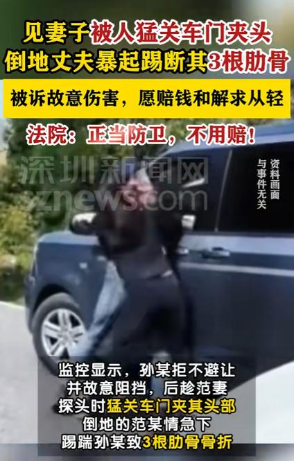 2025年,河南禹州,一男子开车带妻子去医院看病,半路遇到一辆电瓶车挡道,男子便鸣笛示意对方让开,不料,对方不仅不让道还故意放慢车速,男子下车与电瓶车车主理论,没想到,对方不仅不认错还把男子推倒在地。妻子探头查看情况,电瓶车车主猛关车门夹她头部,男子看到后十分气愤,立即从地上爬起并脚踹电瓶车车主,致其3根肋骨骨折。事后,电瓶车车主报警,还向男子索赔15万,结果让人意外。 谁能想到,一趟普通的就医路,会因为一次路权争执,从温情满满变成剑拔弩张,最后闹到索赔十五万、对簿公堂,而法院给出的结果,却让所有人都看清了法律最真实的温度。 2025年3月,河南一名男子正开车载着身体不适的妻子赶往医院,妻子坐在副驾驶上脸色发白,时不时发出轻微的呻吟,男子眼神里满是焦急,只想尽快把妻子送到诊室,让她少受一点病痛的折磨。 车辆平稳行驶到一段窄路时,前方突然出现一辆电瓶车,不紧不慢地骑在道路正中间,把本就不宽的路面占得满满当当,后方车辆根本没法正常超车。 男子心里着急送医,没有按响刺耳的长笛,只是轻轻点了一下喇叭,用最温和的方式提醒前方车主靠边让行。 可接下来的一幕,完全超出了他的预料。电瓶车车主像是被这声轻笛触怒了,不仅没有往路边避让,反而刻意把车速放得更慢,甚至故意往路中间再偏一点,摆明了就是要故意挡路。 男子的耐心一点点被消磨,看着身边难受的妻子,再看看前方刻意刁难的电瓶车,心里的火气慢慢涌了上来。 他把车稳稳停在路边,推开车门走了下去,本想心平气和地和对方沟通,问问为什么不肯让行,解决眼前的通行问题。 可电瓶车车主的态度格外蛮横,不仅没有半点歉意,反而张口就指责男子鸣笛没礼貌,几句话下来,双方的语气都越来越冲。 情绪上头的电瓶车车主突然动手,一把将男子狠狠推倒在地,男子毫无防备,身体重重砸在水泥路面上,手肘和膝盖瞬间擦破了皮,尖锐的疼痛感顺着四肢蔓延开来。 坐在车里的妻子看到丈夫被推倒,瞬间慌了神,顾不上自己的身体不适,赶紧探出头查看情况,还轻声劝双方不要争吵。 可谁也没料到,电瓶车车主此时已经完全失去理智,看到妻子探出头,竟然猛地用力关上汽车车门,厚重的车门狠狠夹在妻子的头部,妻子当场疼得尖叫起来。 这一幕像一根火柴,点燃了男子心里所有的愤怒。自己被推倒也就算了,本就生病的妻子还要被人用这么恶劣的方式伤害,作为丈夫,看着家人受欺负,他根本没法再保持冷静。 男子强撑着从地上爬起来,顾不上身上的疼痛,情急之下一脚踹向电瓶车车主,这一脚带着护妻的急切,力道完全不受控制。 电瓶车车主被踹中后直接倒地,后续送到医院检查,被确诊为三根肋骨骨折,伤情鉴定为轻伤二级。 事情发生后,电瓶车车主第一时间报了警,警方赶到现场固定证据,把双方带回派出所做笔录。 随着调查深入,这起冲突被定性为故意伤害案件,电瓶车车主一方态度十分强硬,不仅要求追究男子的刑事责任,还开口提出十五万元的赔偿要求。 男子得知后心里满是无奈,他知道自己动手伤人不妥,一开始也愿意拿出合理的费用协商和解,希望能得到从轻处理,可对方十五万的索赔金额,远远超出了合理范围,双方始终谈不拢,最终只能闹上法庭。 法庭上,双方围绕着男子的行为到底是故意伤害还是正当防卫,展开了激烈的争辩,法官综合现场监控、证人证言、伤情报告等全部证据,最终认定男子的行为属于正当防卫,没有超过必要限度,既不构成故意伤害犯罪,也不需要承担民事赔偿责任。 正当防卫的条款,从来不是为了鼓励暴力,而是为了保护每一个守法公民的底气。面对故意挑衅、主动施暴的行为,普通人不必忍气吞声,更不用为不法侵害者的过错买单。 法律不会冤枉一个好人,也不会纵容一个无理取闹的人,它会站在事实和正义的一边,守护每一个普通人最基本的安全与尊严。 一趟原本只为看病的平凡行程,一场本可避免的道路争执,一次情急之下的防卫反击,一场索赔十五万的法庭之争,最后以正当防卫的判决画上句号,法院用最公正的裁决告诉所有人,保护家人、制止不法,永远会被法律站在身后撑腰。 对于这件事,您有什么想说的吗?欢迎评论区留言讨论。 信源:深圳新闻网2025-03-28——《见妻子被故意关车门夹头丈夫踢断人三根肋骨》