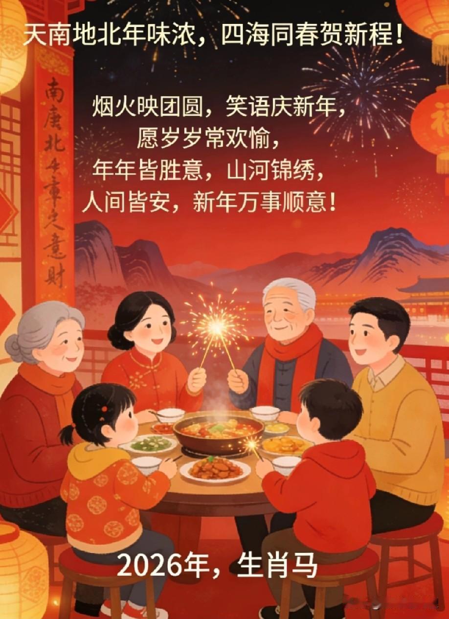 天南地北大拜年天南地北年味浓,四海同春贺新程!烟火映团圆,笑语庆新年,愿岁岁常欢愉,年年皆胜意,山河锦绣,人间皆安,新年万事顺意!