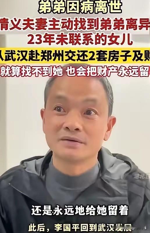 “简直就是菩萨转世!”男子离异后,1岁女儿被判给前妻,两人从此再无交集!不料,23年后男子去世,哥哥竟不顾反对,主动找到23年没有联系的侄女,主动将男子的存款及其名下2套房产转与侄女,甚至扬言:“就算找不到她,我也会把财产永远给她留着。 故事的主人公之一,是一位普通的男子,曾经,他与妻子携手走进婚姻的殿堂,不久后,爱情结晶——女儿呱呱坠地。然而,这段婚姻并未如想象中那般长久,在女儿仅仅一岁的时候,夫妻二人感情破裂,最终走向了离异。经过法律的判定,女儿判给了前妻,从此,他和前妻各自走上不同的人生道路,再无交集。 时光如同白驹过隙,一晃 23 年过去了。在这漫长的岁月里,男子独自生活,努力工作,日子虽平淡,但也在默默前行。然而,命运却对他开了一个残酷的玩笑,男子不幸患上重病,尽管他积极与病魔抗争,但最终还是没能战胜死神,撒手人寰。 男子离世后,处理后事的重担落在了他哥哥的肩上。哥哥在整理遗物时,发现弟弟留下了一笔存款,以及名下的两套房产。面对这些财产,哥哥陷入了沉思。按理说,弟弟已经去世,且父母也早已不在人世,这些财产哥哥是有继承权的。但哥哥心中却有另一个声音在回响。 他想起了 23 年前那个尚在襁褓中的侄女。自弟弟离异后,这 23 年来,他从未见过侄女一面,甚至没有任何关于她的消息。但哥哥深知,侄女是弟弟在这世上唯一的血脉延续。在一番深思熟虑后,哥哥做出了一个令人意想不到的决定。 他不顾周围人的反对,毅然决然地踏上了寻找侄女的道路。有人劝他:“都 23 年了,孩子说不定都不知道在哪儿,何必费这个劲呢,这些财产你拿着也理所当然。”但哥哥不为所动,他坚定地说:“这是弟弟的血脉,这些财产本就该属于她,我一定要找到她。” 哥哥开始四处打听侄女的下落。他先是联系了弟弟前妻曾经的一些熟人,可这些人大多也都失去了联系。但哥哥没有放弃,他又去了当地的居委会,翻查过去的档案记录,还在网上发布了寻找侄女的信息。每一条线索,他都不放过,哪怕希望渺茫,他也拼尽全力去追寻。 终于,在经过漫长而艰辛的寻找后,哥哥得知侄女可能在另一个城市生活。他毫不犹豫地踏上旅程,辗转多地,终于找到了侄女。当他站在侄女面前时,侄女眼中满是惊讶与疑惑,毕竟 23 年没有联系,她对这位伯伯几乎没有任何印象。 哥哥看着眼前已经长大成人的侄女,心中百感交集。他向侄女讲述了弟弟的一生,以及他离世的消息,随后表明了来意。他说:“孩子,这是你爸爸留下的存款和两套房产,我今天就是来把这些交给你的。”侄女听后,眼中满是震惊,她怎么也没想到,在时隔 23 年后,还能与父亲的家人有这样的交集,而且是收到这样一份意想不到的遗产。 侄女眼中闪烁着泪花,她嗫嚅着:“伯伯,这太突然了,我……”哥哥微笑着打断她:“孩子,这是你应得的。就算我找不到你,我也会把这些财产永远给你留着,因为你是你爸爸的女儿,这是你们之间的血脉传承。” 这个消息传开后,小城的人们纷纷为之动容。大家都感叹哥哥的人品实在难得,在这个物欲横流的社会,他能坚守着血脉亲情,不顾他人反对,执意将财产归还给素未谋面 23 年的侄女。这样的举动,不仅体现了他对弟弟的手足情深,更展现了他高尚的品德和对血脉传承的尊重。这个故事,如同冬日里的暖阳,温暖着每一个人的心田,让人们相信,在这个世界上,总有一些珍贵的东西,如亲情、如坚守,是金钱无法衡量的。