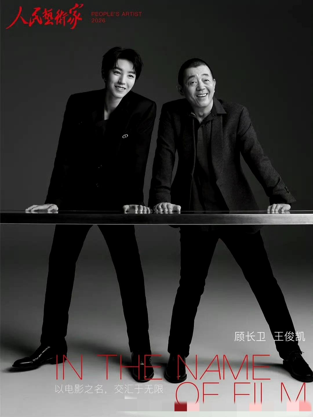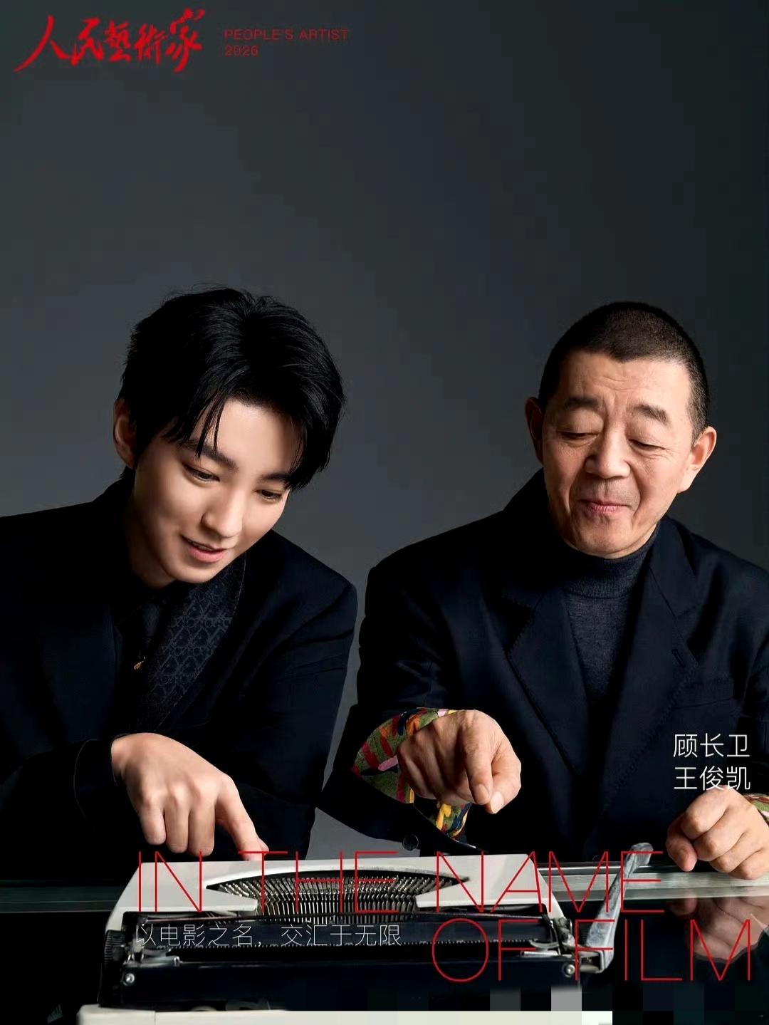 王俊凯×顾长卫《人民艺术家》封面大片释出!《刺猬》售后氛围感拉满✨ 当青年演员王俊凯与导演顾长卫同框,镜头里藏的是两代电影人的对话与传承。《人民艺术家》2026开年封面大片里,黑白西装的利落、复古打字机的质感、蓝黄泼墨的艺术张力,每一帧都在诉说“以电影之名,交汇于无限”的故事。 从《刺猬》里的细腻表演,到杂志大片里的松弛气场,王俊凯用镜头语言完成了一次从角色到自我的延伸;而顾长卫的沉稳与锐利,则在同框瞬间勾勒出电影艺术的厚度。这组大片不仅是时尚表达,更是两代电影人对创作初心的致敬。 王俊凯 顾长卫 人民艺术家杂志 电影刺猬