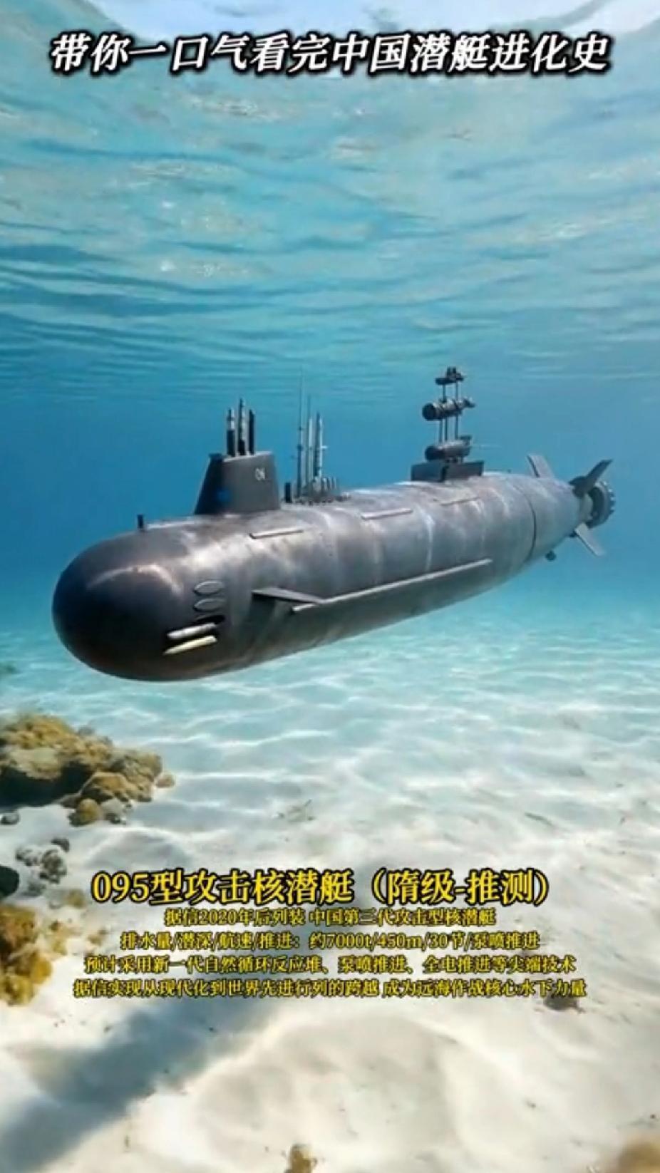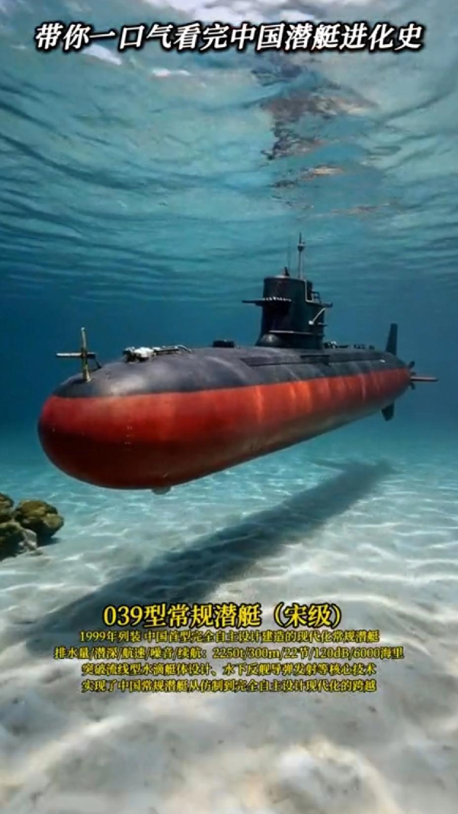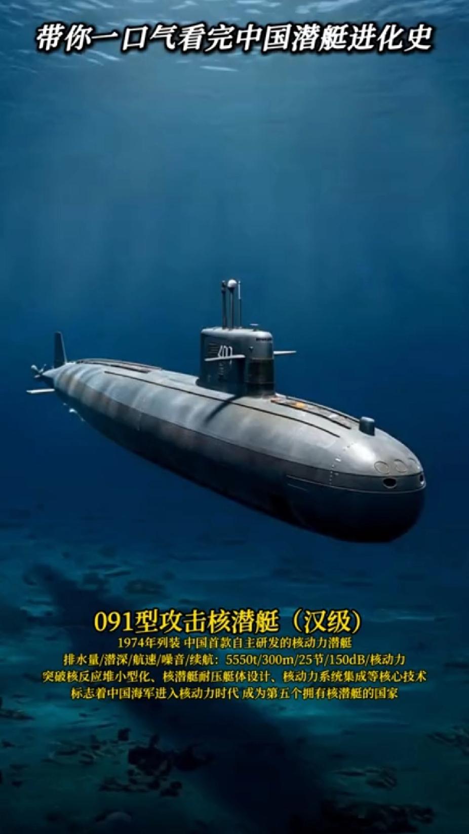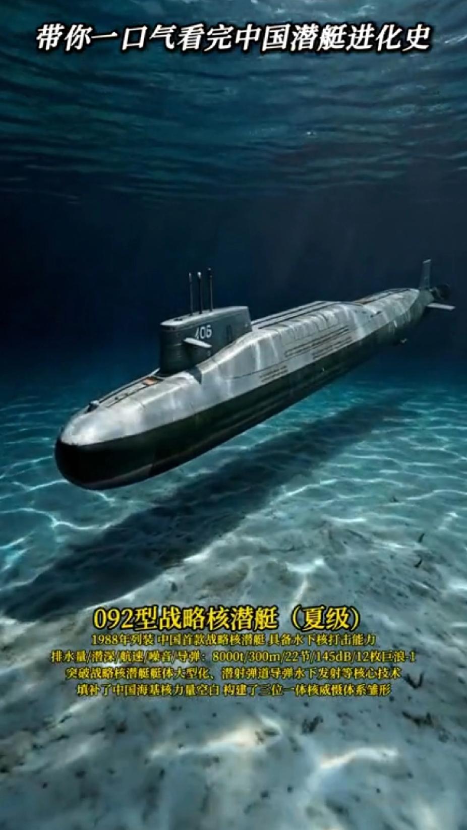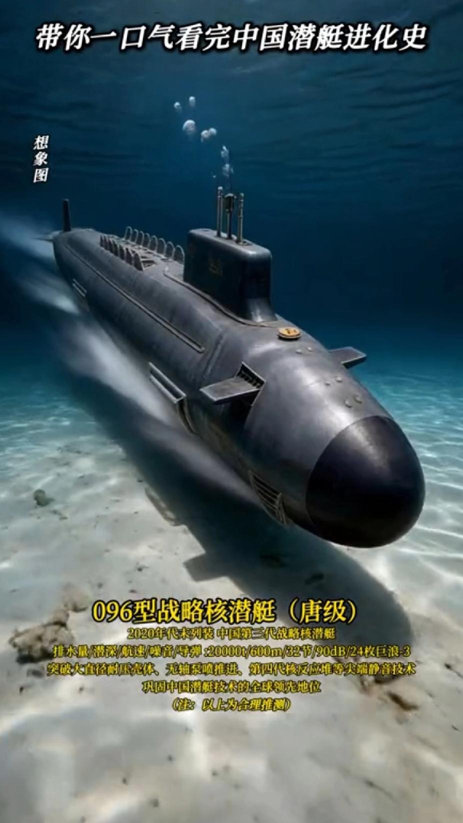 带你一口气看完中国潜艇进化史 点击链接观看视频👉条 033型常规潜艇(R级) 1966年列装 中国首款仿制后实现全国产化并批量列装的常规潜艇 排水量/潜深/航速/噪音/续航:1830t/200m/13节/160dB/6000海里 突破潜艇基础建造工艺、耐压艇体焊接、常规柴电动力系统集成等技术 结束了中国海军无批量列装自研潜艇的历史 091型攻击核潜艇(汉级) 1974年列装 中国首款自主研发的核动力潜艇 排水量/潜深/航速/噪音/续航:5550t/300m/25节/150dB/核动力 突破核反应堆小型化、核潜艇耐压艇体设计、核动力系统集成等核心技术 标志着中国海军进入核动力时代 成为第五个拥有核潜艇的国家 092型战略核潜艇(夏级) 1988年列装 中国首款战略核潜艇 具备水下核打击能力 排水量/潜深/航速/噪音/导弹:8000t/300m/22节/145dB/12枚巨浪-1 突破战略核潜艇艇体大型化、潜射弹道导弹水下发射等核心技术 填补了中国海基核力量空白 构建了三位一体核威慑体系雏形 039型常规潜艇(宋级) 1999年列装 中国首型完全自主设计建造的现代化常规潜艇 排水量/潜深/航速/噪音/续航:2250t/300m/22节/120dB/6000海里 突破流线型水滴艇体设计、水下反舰导弹发射等核心技术 实现了中国常规潜艇从仿制到完全自主设计现代化的跨越 039A/B型常规潜艇(元级) 2006年列装 中国首款搭载AIP系统的自主研发现代化常规潜艇 排水量/潜深/航速/噪音/续航:3600t/350m/20节/110dB/AIP系统 突破斯特林发动机AIP系统国产化、综合静音降噪等核心技术 大幅提升了隐蔽性和水下持续作战能力 追平世界先进水平 094/094A型战略核潜艇(晋级) 2007/2010年后列装 中国首款具备有效洲际核威慑能力的战略核潜艇 排水量/潜深/航速/导弹:11000t/400m/26节/12枚巨浪-2 突破大直径耐压艇体设计、巨浪-2导弹、核潜艇静音升级等核心技术 实现了海基核威慑从有到强的跨越 成为可靠的洲际核反击力量 095型攻击核潜艇(隋级-推测) 据信2020年后列装 中国第三代攻击型核潜艇 排水量/潜深/航速/推进:约7000t/450m/30节/泵喷推进 预计采用新一代自然循环反应堆、泵喷推进、全电推进等尖端技术 据信实现从现代化到世界先进行列的跨越 成为远海作战核心水下力量 096型战略核潜艇(唐级) 2020年代未列装 中国第三代战略核潜艇 排水量/潜深/航速/噪音/导弹:20000t/600m/32节/90dB/24枚巨浪-3 突破大直径耐压壳体、无轴泵喷推进、第四代核反应堆等尖端静音技术 巩固中国潜艇技术的全球领先地位(注:以上为合理推测)