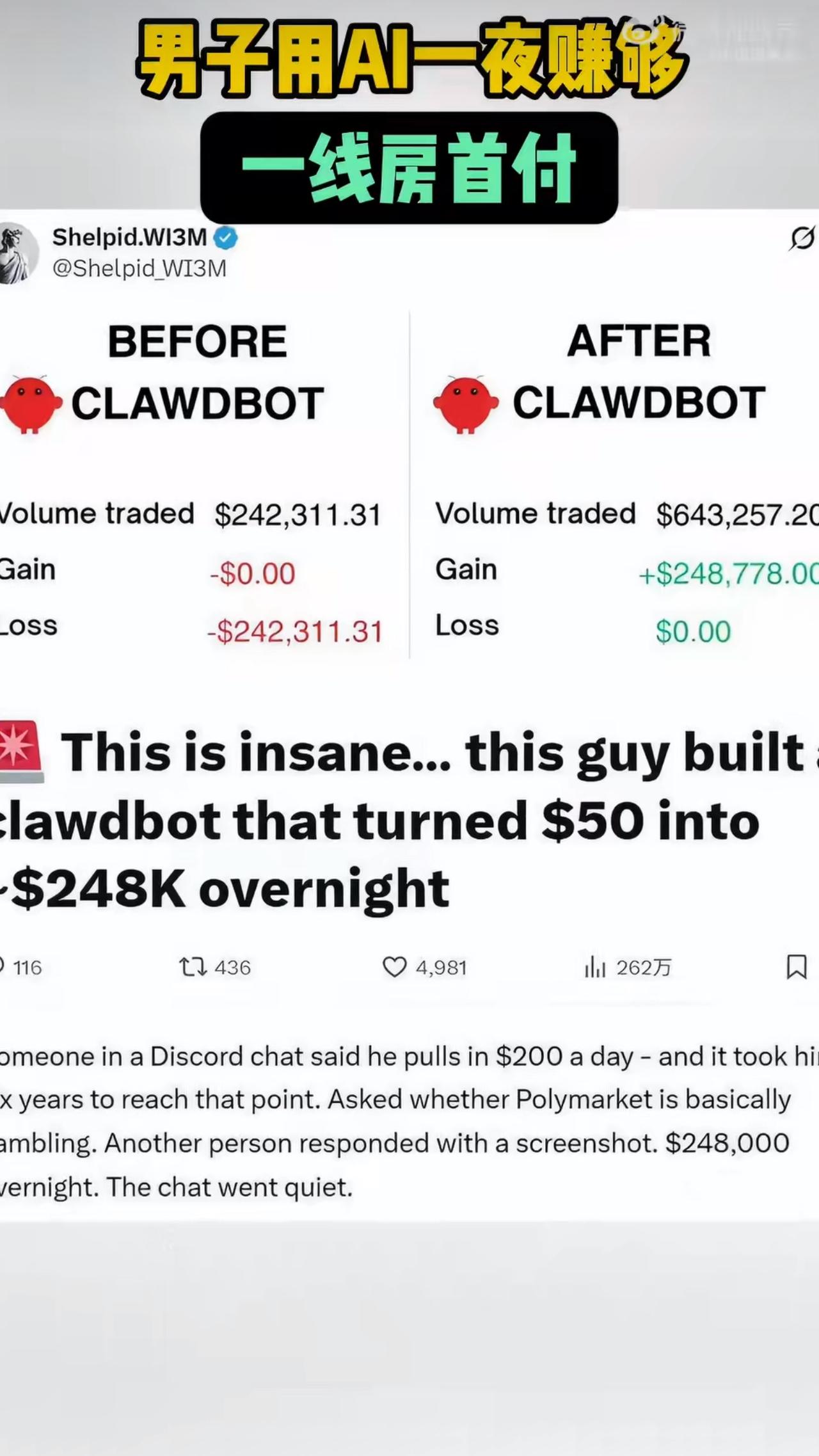 有位海外匿名用户用AI工具炒加密货币,40小时就把50美元变成了24.5万美元,这笔钱足够在国内一线城市付套小户型的首付了,消息传开后,网友们都沸腾了,有人直呼“技术革命改变命运”,也有人冷笑“这不过是资本割韭菜的新剧本”, 故事的主角是个普通投资者,他用的AI工具叫OpenClaw,最近在全球科技圈火得一塌糊涂,这玩意儿的核心功能是“舆情监测+高频交易”:它能实时扫描推特、Reddit等社交平台上的用户情绪,比如当某个加密货币突然被大量讨论“要暴涨”时,AI会立刻结合历史价格数据,用算法判断买入时机;要是监测到“跑路”“骗局”等负面关键词,又会秒速抛售止损,更狠的是,它还能自动加杠杆,用借来的钱放大收益,相当于把传统投资需要数月甚至数年的决策过程,压缩到了以秒为单位的“闪电战”。 这位匿名用户的操作堪称“教科书级投机”,他先用50美元试水,AI在40小时内完成了上千次交易,每次买卖都精准踩中市场情绪的波动点,最终账户显示24.5万美元的余额时,连他自己都懵了,这收益增幅近5000倍,比买彩票中头奖的概率还低,但仔细一琢磨,这事儿其实经不起推敲,金融市场有个残酷的“幸存者偏差”:媒体只会报道赚到钱的人,可同期有多少人因为杠杆爆仓、血本无归?有数据统计,加密货币市场每天有超过30%的账户被强制平仓,这些“失败案例”根本不会出现在热搜里。 AI在这场“暴富”里更像个“高级工具人”,舆情监测技术早就存在,AI只是把人工分析数据的时间从几小时缩短到几秒,高频交易也不是新玩意儿,华尔街的量化基金早就玩得炉火纯青,把收益全归功于AI,工具再厉害,也得看谁在用。 更值得警惕的是,这类“AI暴富神话”正在制造新型社会焦虑,一线城市年轻人攒首付需要十年,而有人用AI40小时就“逆天改命”,这种对比会让普通人产生“不跟上技术就会被淘汰”的恐慌,可真相是,加密货币市场本身就充满泡沫,AI的介入不过是让赌局变得更刺激,有人一夜暴富,就有人倾家荡产,而平台和算法提供方永远稳赚手续费。 说到底,AI是工具,不是印钞机,它可以帮我们提高效率、规避风险,但别指望它能颠覆金融市场的底层逻辑性,风险和收益永远成正比,下次再看到“AI暴富”的新闻,不妨先问一句:那些没被报道的爆仓账户,又该找谁哭去呢?AI赚钱 ai数字货币 男子用AI一夜赚够一线房首付 事件来源:中国网看点