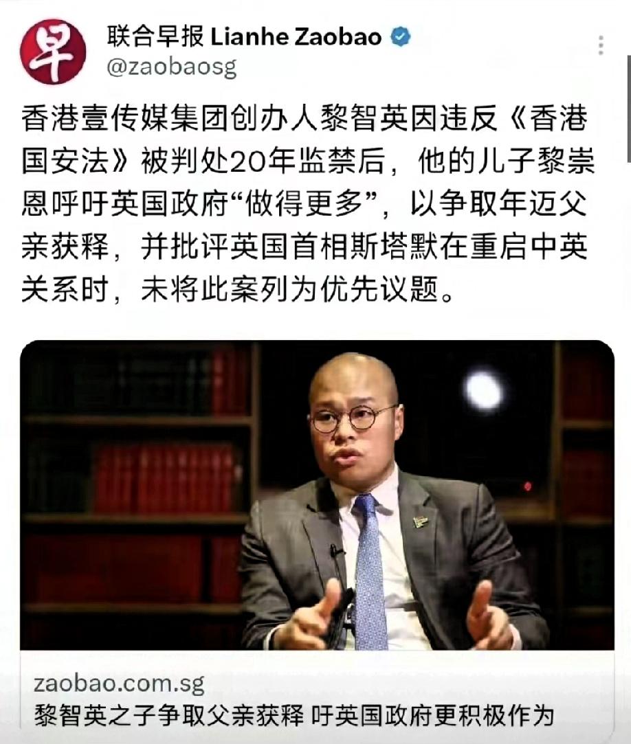 黎智英的儿子,在新加坡联合早报喊话英国首相斯塔默。 这一幕看着像情急救父,其实根本不是亲情,而是一场精心盘算的政治表演。 黎智英的案子,是依法审理、证据确凿的法治案件。 可在他儿子眼里,好像只要找外国政客发声,就能把司法判决翻过来。 这种急红眼的操作,本质上是乱港分子最后的挣扎,还在赌外部干涉。 他们到现在还没看明白:香港的法治,不是谁喊几句就能动摇的。 违法的事实摆在那里,再怎么向外国求助,也改变不了已经生效的判决。 所谓求救,更像是在给自己找存在感,而不是真的有翻盘可能。 再看英国这边,斯塔默政府其实非常清醒。 最近英国一直在推进中英经贸合作,看重的是长期务实利益。 在国家利益面前,乱港分子充其量就是一颗随时可以放弃的棋子。 英国不会为了一颗弃子,毁掉自己的外交布局和经济合作。 所谓声援,最多停留在口头,不可能真的拿出实际行动。 这一点,不管是黎家,还是看热闹的人,心里其实都很清楚。 更让人看清的是西方一贯的双标操作。 美方一些议员立刻跟风叫嚣,还有不少国家跟着一起炒作。 他们把一个正常的司法案件,强行包装成政治话题。 嘴上喊着人权与法治,实际上就是在干涉中国内政。 这种双重标准,早就被大家看得明明白白,说服力越来越低。 越是这样抱团表演,越显得心虚和别有用心。 这件事里,还藏着两场暗战和两个关键信号。 第一个信号:乱港势力早就翻不起浪了,只能靠对外喊话博眼球。 他们在香港社会早已失去支持,成了真正的孤家寡人。 第二个信号:西方想插手香港事务的路子,已经越来越走不通。 中国的主权底线清晰明确,香港的法治和稳定,不容任何外部指手画脚。 谁想插手,谁就会碰一鼻子灰。 整件事看下来,就是一场很荒唐的闹剧。 黎智英获刑,是依法惩处,不是谁喊几句就能改变的。 他儿子的对外求救,更像是一场自导自演的戏。 英国不会为棋子牺牲利益,西方的炒作也掀不起大浪。 香港是中国的香港,香港的法治,中国人自己守得住。 任何想插手、想捣乱的势力,最终都只会白费力气。 读者们,你们怎么看,评论区讨论讨论。