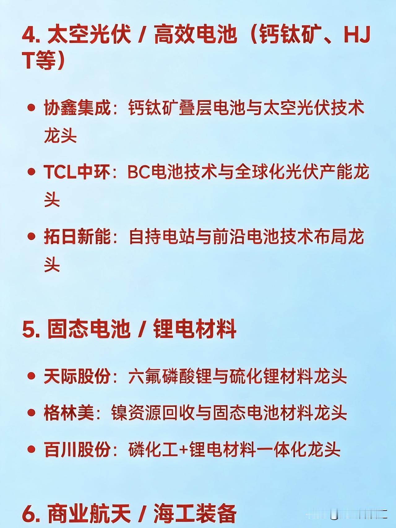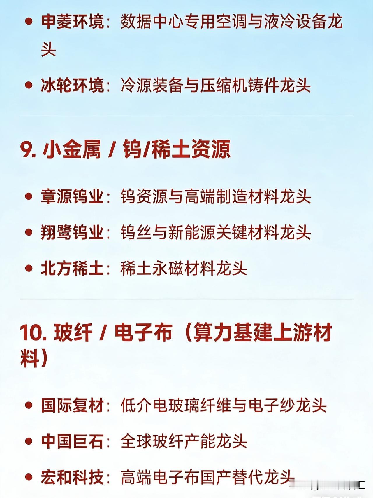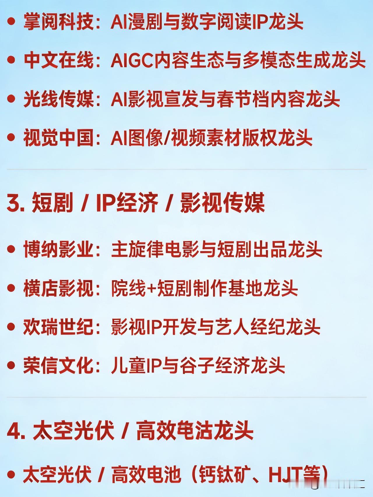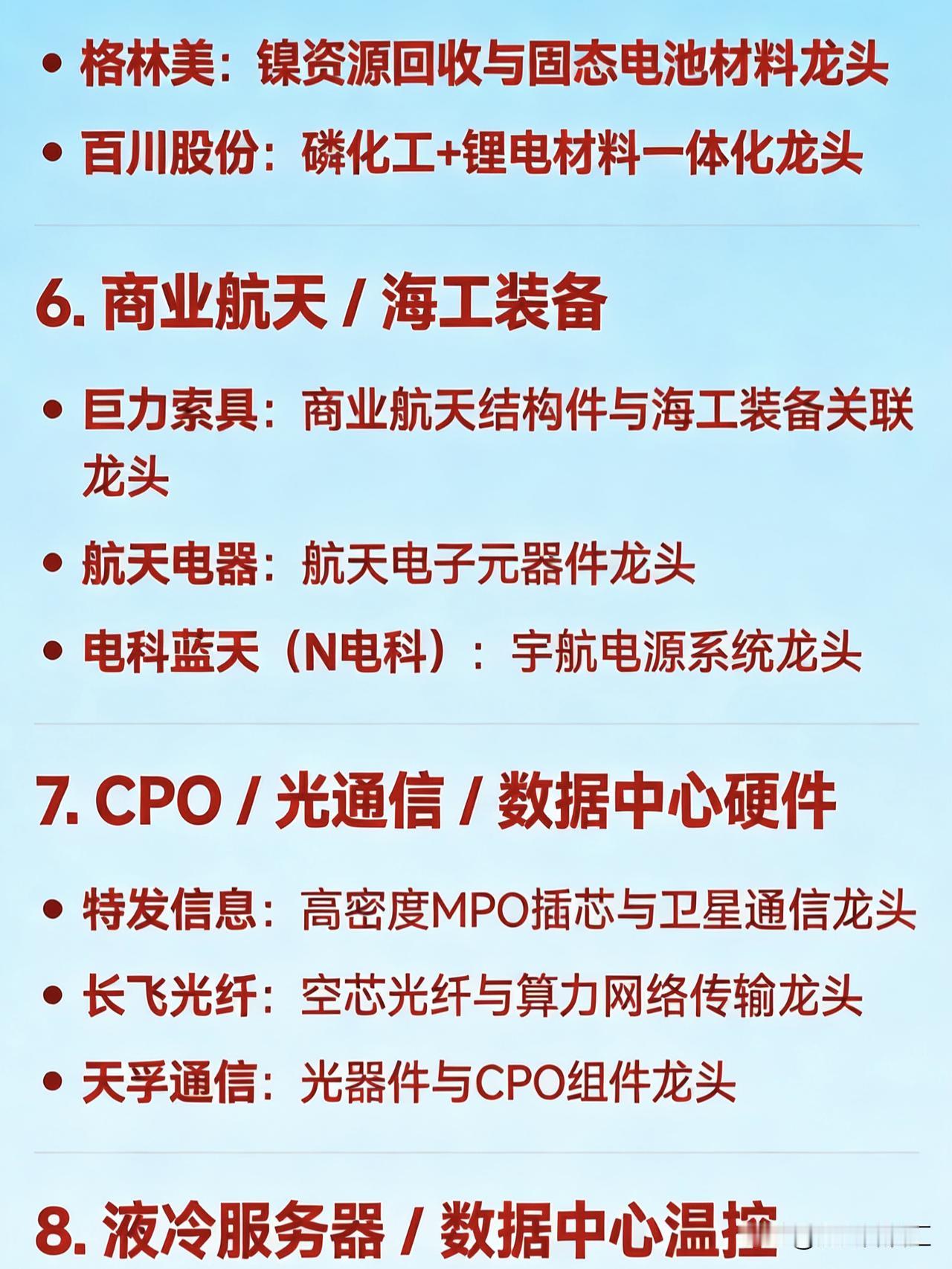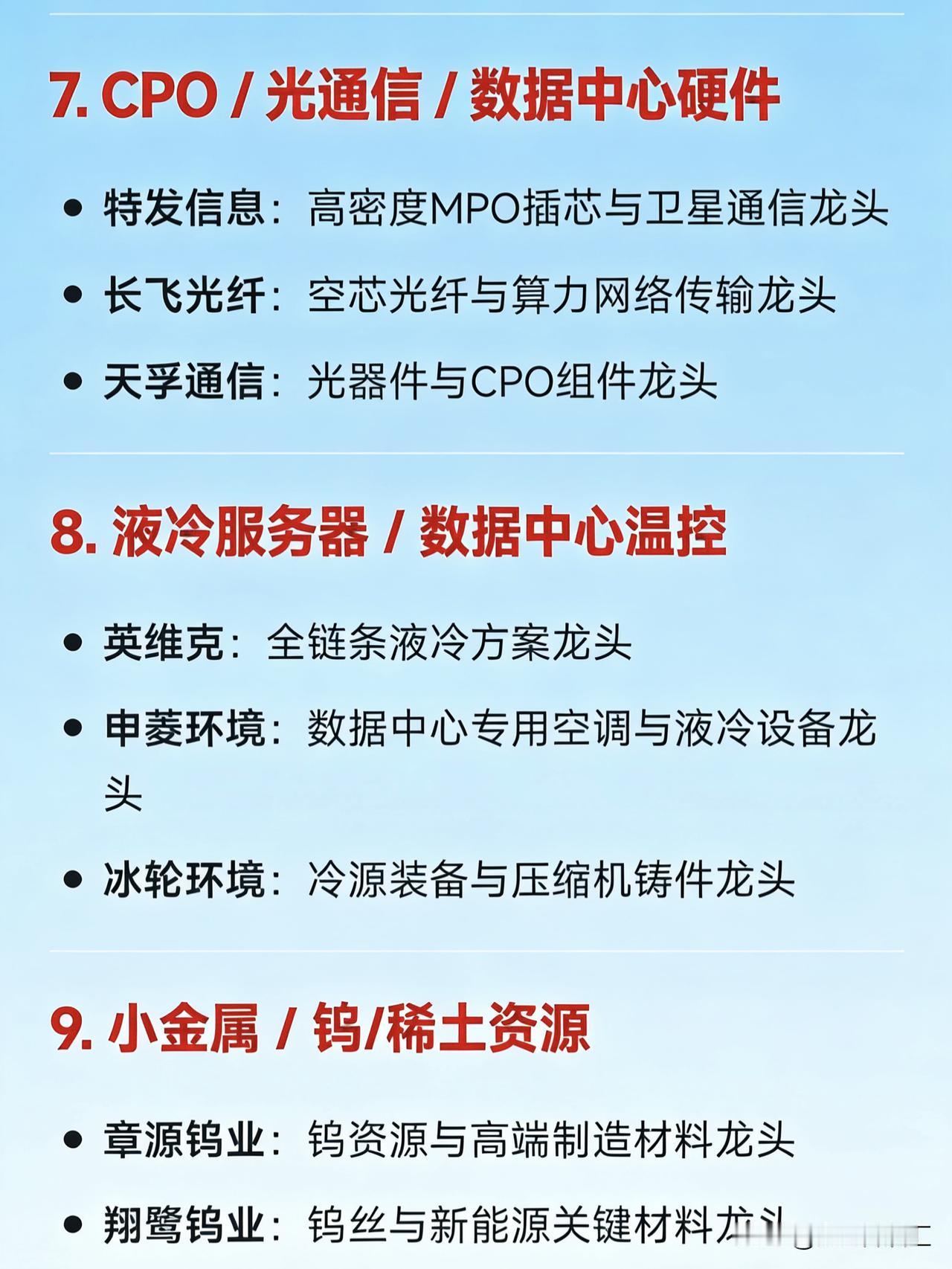 2026年2月12日十大热点科技及其产业链核心龙头 1. 算力租赁 / 东数西算 / AI算力基建 大位科技:算力租赁与东数西算项目参与龙头 网宿科技:边缘计算与算力服务龙头 特发信息:CPO共封装光学+算力网络龙头 优刻得:公有云与算力服务价格调整龙头 2. AI视频 / 文生视频(Sora / Seedance 概念) 捷成股份:AI语料与新媒体版权运营龙头 掌阅科技:AI漫剧与数字阅读IP龙头 中文在线:AIGC内容生态与多模态生成龙头 光线传媒:AI影视宣发与春节档内容龙头 视觉中国:AI图像/视频素材版权龙头 3. 短剧 / IP经济 / 影视传媒 博纳影业:主旋律电影与短剧出品龙头 横店影视:院线+短剧制作基地龙头 欢瑞世纪:影视IP开发与艺人经纪龙头 荣信文化:儿童IP与谷子经济龙头 4. 太空光伏 / 高效电池(钙钛矿、HJT等) 协鑫集成:钙钛矿叠层电池与太空光伏技术龙头 TCL中环:BC电池技术与全球化光伏产能龙头 拓日新能:自持电站与前沿电池技术布局龙头 5. 固态电池 / 锂电材料 天际股份:六氟磷酸锂与硫化锂材料龙头 格林美:镍资源回收与固态电池材料龙头 百川股份:磷化工+锂电材料一体化龙头 6. 商业航天 / 海工装备 巨力索具:商业航天结构件与海工装备关联龙头 航天电器:航天电子元器件龙头 电科蓝天(N电科):宇航电源系统龙头 7. CPO / 光通信 / 数据中心硬件 特发信息:高密度MPO插芯与卫星通信龙头 长飞光纤:空芯光纤与算力网络传输龙头 天孚通信:光器件与CPO组件龙头 8. 液冷服务器 / 数据中心温控 英维克:全链条液冷方案龙头 申菱环境:数据中心专用空调与液冷设备龙头 冰轮环境:冷源装备与压缩机铸件龙头 9. 小金属 / 钨/稀土资源 章源钨业:钨资源与高端制造材料龙头 翔鹭钨业:钨丝与新能源关键材料龙头 北方稀土:稀土永磁材料龙头 10. 玻纤 / 电子布(算力基建上游材料) 国际复材:低介电玻璃纤维与电子纱龙头 中国巨石:全球玻纤产能龙头 宏和科技:高端电子布国产替代龙头