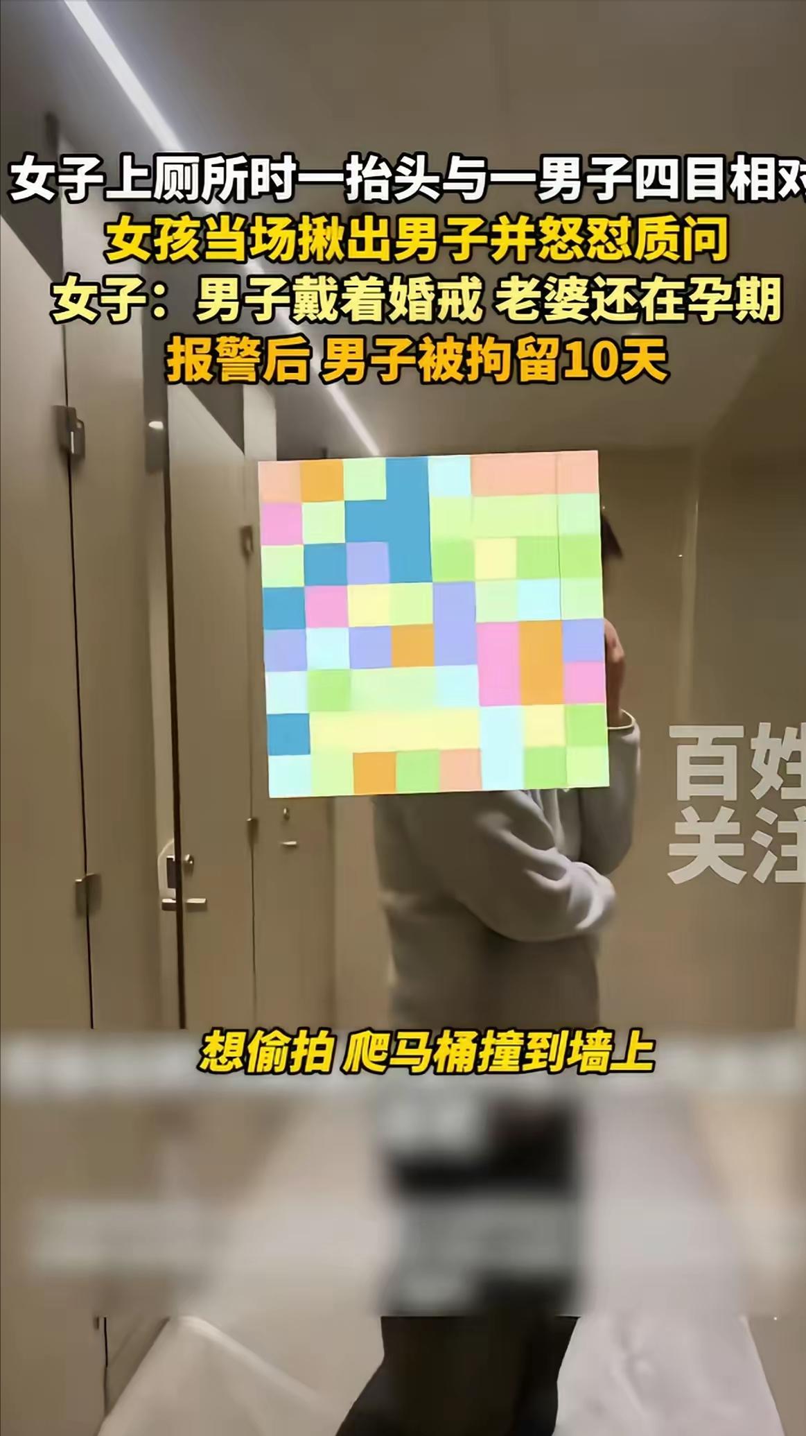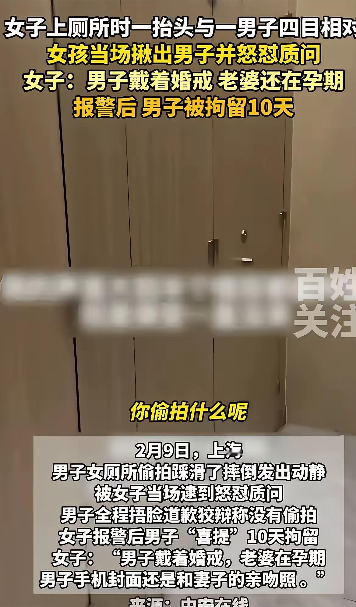 太不要脸了!上海一女子在写字楼上厕所时,没想到隔壁隔间内竟然传来男人的声音,意识到被偷拍的女子,当即就起身,堵在了厕所门口,在女子厉声斥责下,偷拍的男子从隔间双手捂脸走了出来,然而男子却不肯定承认自己的罪行,更可气的是,男子手机屏保合照的妻子此时还怀着孕。 2月9日晚上,临近下班,外面天寒地冻,人流稀稀拉拉,大部分店铺已经打烊,卫生间里也格外冷清。 一女子刚结束一天的工作,浑身疲惫,被尿意催着匆匆走进的卫生间。 她没多想,找了个隔间进去,本想速战速决赶紧回家,却没料到,一场惊吓正在隔壁悄然酝酿。 女子上完厕所准备提裤子时,耳边突然传来一阵极轻的男人动静,在寂静的卫生间里格外清晰,打破了原本的安静。 女子瞬间僵住,一股寒意从后背直冒,下意识屏住呼吸,心脏狂跳不止。 她强压恐惧,慢慢低下头看向隔间下方的缝隙,这一看差点魂飞魄散——缝隙里,一双贼溜溜的眼睛正死死盯着她,四目相对的瞬间,女子浑身发麻,瞬间明白自己被偷拍了。 紧接着,她猛地拉开隔间门,快步冲到卫生间大门口,死死堵住唯一出口,杜绝了偷拍男子逃跑的可能。 女子气得浑身发抖,压低声音却带着十足威严,厉声斥责隔壁隔间的人,要求对方立刻出来。 没过多久,隔间门被拉开一条缝,一个男子慢慢走了出来,全程双手紧紧捂脸,脑袋埋得很低,连看女子一眼的勇气都没有,脚步磨磨蹭蹭,一副做贼心虚的模样。 即便被当场堵截,男子依旧毫无悔改之意,还在狡辩试图蒙混过关。 面对质问,他嘴硬得很,一口咬定自己只是不小心走错厕所,不是故意偷拍,脸上没有丝毫愧疚,反而带着一丝侥幸。 女子看穿了他的谎言,提出要查看他的手机,确认是否有偷拍的视频和照片。 听到要查手机,男子瞬间没了底气,狡辩声戛然而止,变得沉默寡言,支支吾吾不肯拿出手机,双手紧紧攥着口袋,生怕秘密被发现。 女子见他拒不配合,不再过多纠缠,当即拿出手机拨打报警电话,决定用法律维护自己的权益,让男子为龌龊行为付出代价。 民警很快赶到现场,面对询问调查,男子再也装不下去,侥幸和嘴硬彻底消失,双腿一软没了底气。 他放弃抵抗,如实交代了偷拍行为,承认自己故意潜入女厕所,趁女子如厕时偷拍,只为满足自己的私欲。 女子担心私密内容泄露,在民警允许下拿过男子手机,准备删除相关内容。 可点亮屏幕的那一刻,她瞬间被震惊,怒火又添了几分。 男子的手机屏保,是他和一名女子的甜蜜合照,两人笑得十分幸福,看起来格外恩爱。 经民警询问得知,照片上的女子是他的妻子,此时已经怀有身孕,正在家里安心养胎,满心期待新生命的到来,根本不知道丈夫在外面干着这样龌龊的事。 他不仅侵犯了陌生女子的隐私,给对方留下难以抹去的心理阴影,更背叛了怀孕的妻子,让她在孕期承受沉重打击,让未出生的孩子蒙羞,这样的行为确实太不要脸、太枉为人。 10天的拘留或许短暂,但背后的影响远超于此。 对受害女子来说,这场偷拍会成为心理阴影;对男子的妻子来说,背叛的伤害难以愈合,对男子自己来说,拘留会留下违法记录,失去家人信任,毁掉原本幸福的家庭。 男子的所作所为,完美诠释了“知人知面不知心”,外表或许光鲜,背地里却干着龌龊勾当。