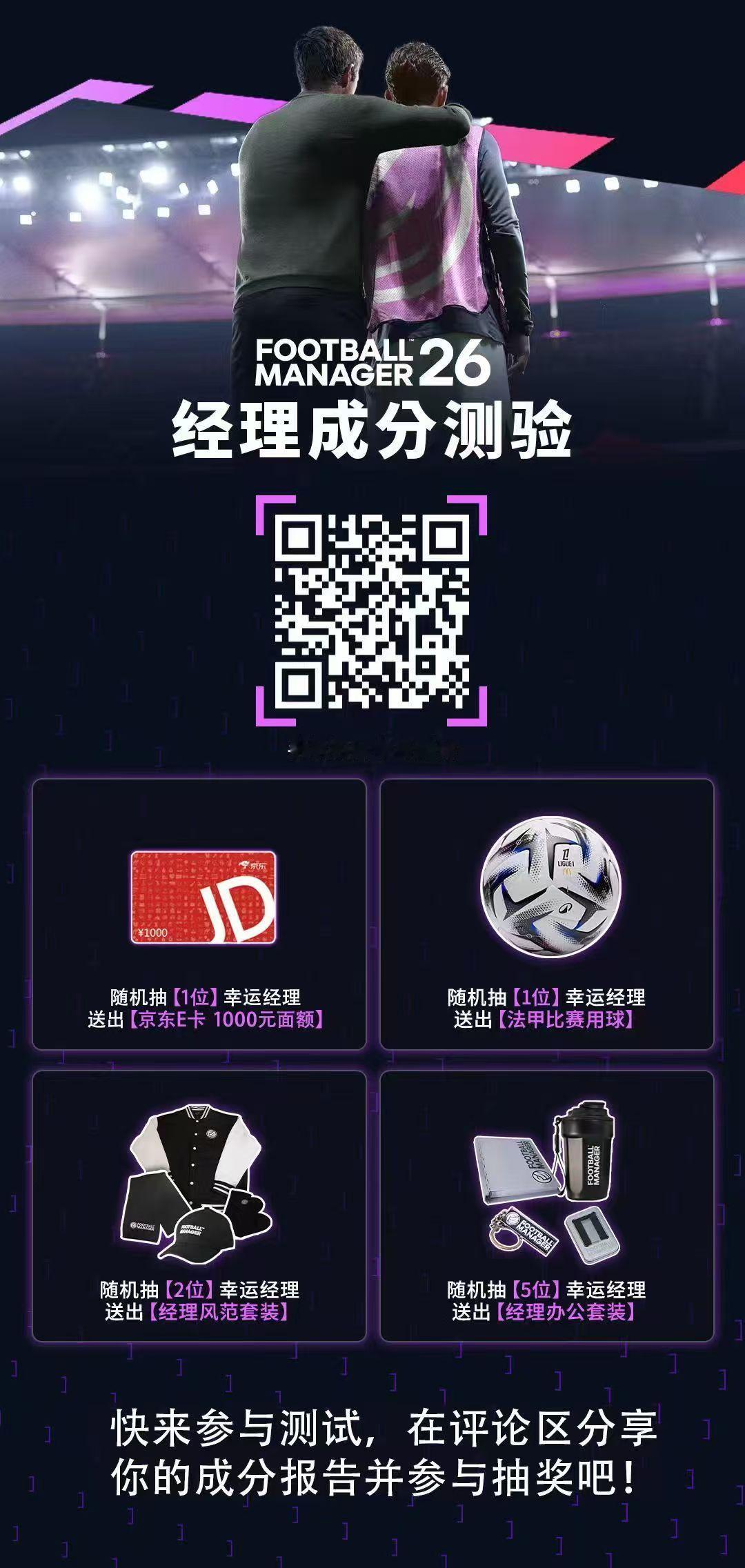 法甲 春节宅家球迷速冲!⚽️FM26 经理成分测验上线啦,手机端答趣味问题就能生成专属经理成分报告,把结果发到官方置顶活动帖,就能抽千元京东卡、法甲比赛足球等大奖🎁点击链接或者扫描图片上的二维码(仅限手机端):网页链接FM 经理成分测验足球经理26FM26