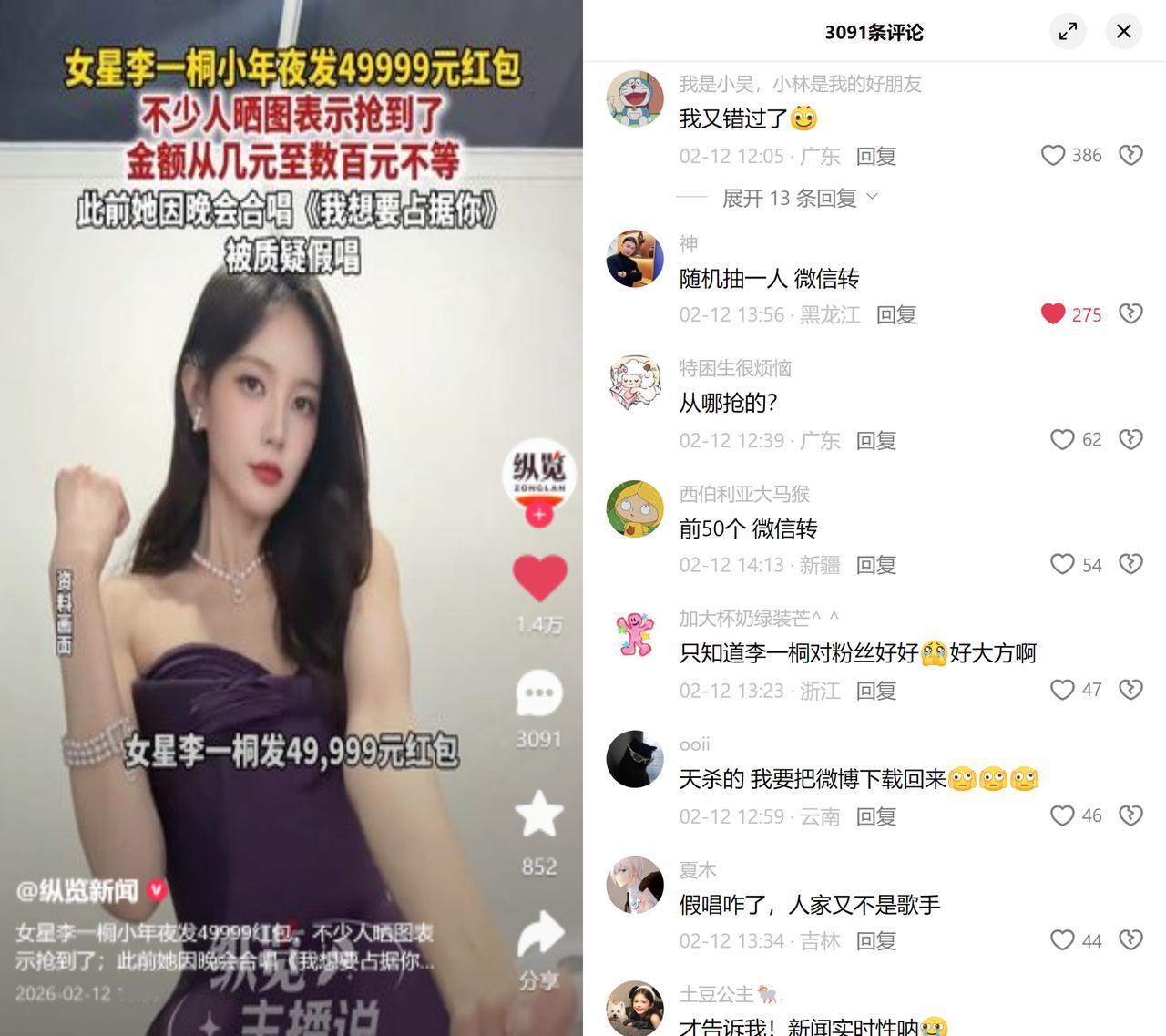 李一桐用49999红包灭火 前几天她刚被质疑晚会假唱,争议还没发酵开,小年夜就直接甩了个49999元现金红包。 结果留言区秒变抢红包狂欢,没人再揪着假唱不放,全在喊怎么没抢到、我要下微博。 别以为这个49999是随便选的,这可是内娱高额红包的顶格惯例! 赵露思、陈哲远、白鹿都发过这个数,差一块到5万,既显得大方到极致,又避开炫富嫌疑,把诚意感拉得满满。 这公关套路真的绝了:与其跟大家掰扯我没假唱,不如直接用红包击中各位的错失焦虑。 毕竟比起纠结明星的业务能力,没抢到红包的懊悔感,才是普通人更在意的。你看留言里都有人说假唱咋了,这不就被完美转移了注意力? 不得不说,内娱的公关真把人性摸得透透的。用一个卡在顶格却克制的红包,轻松把争议消于无形,这手腕,不服都不行! 你要是没抢到这红包,是不是也得拍大腿后悔?