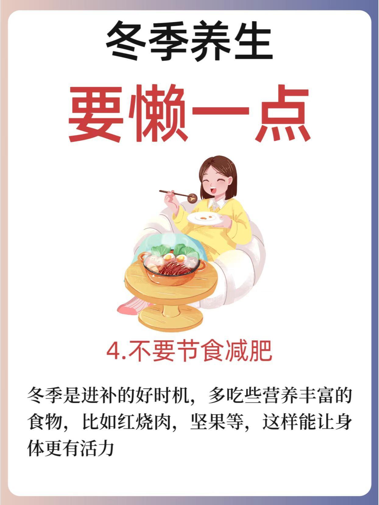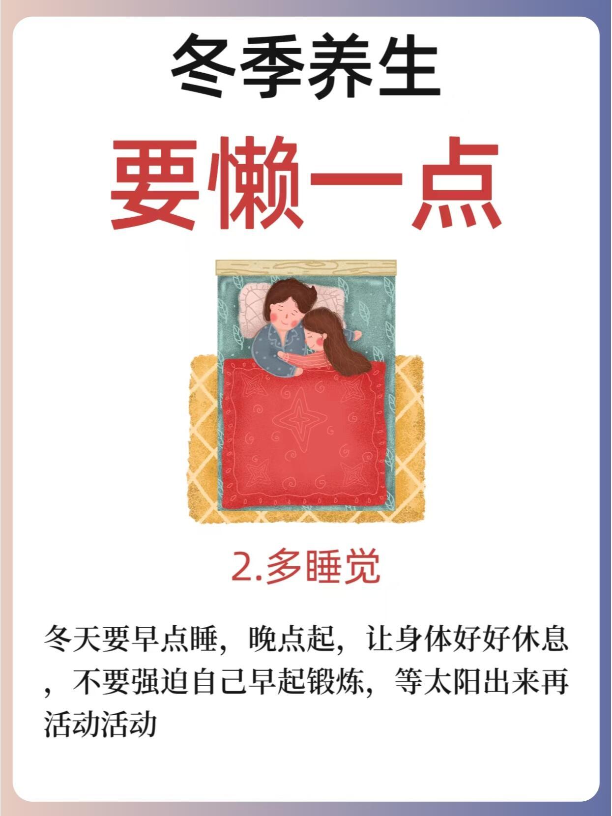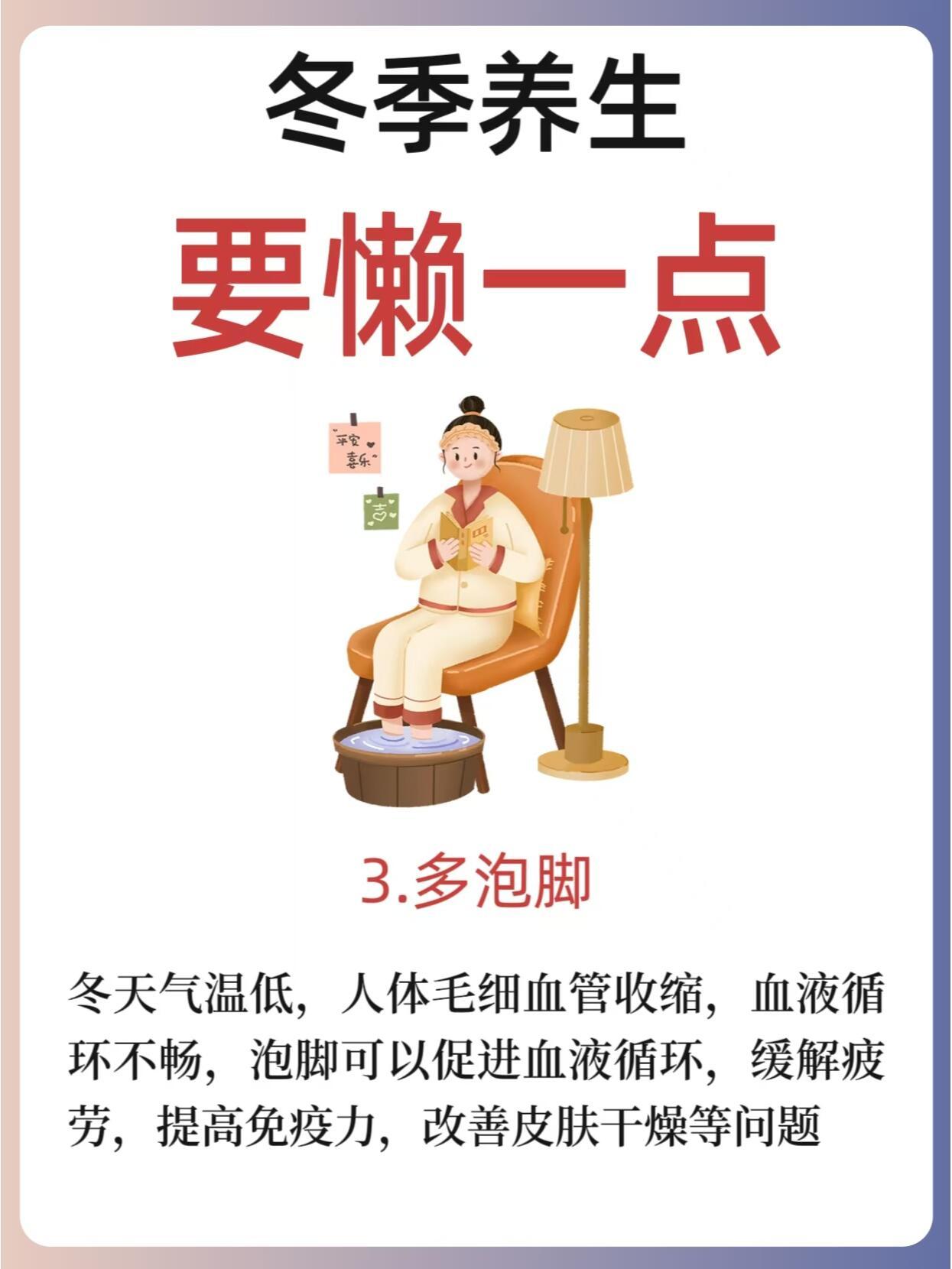 冬季养生,要“懒”一点!🛌❄️冬季养生,适度“懒”出健康!随着冬季的到来,自然界万物进入闭藏状态,人体阳气也随之收敛。在这样的季节里,我们的养生策略也应该顺应自然规律,注重保暖、休息和饮食。适度的“懒”可以让我们更好地恢复体力和精力,但也要注意不要过度懒散,保持适度的锻炼。🌟冬季养生“懒”策略:少洗澡:冬季皮肤容易干燥,减少洗澡次数有助于保持皮肤水分,避免过度清洁导致皮肤干燥。多睡觉:冬季是藏精的季节,充足的睡眠有助于身体恢复和调养,顺应阳气收敛的自然规律。多泡脚:泡脚可以促进血液循环,缓解疲劳,温暖身体,尤其在寒冷的冬天,更是一种舒适的养生方式。不要节食减肥:冬季身体需要更多的能量来抵御寒冷,保持足够的营养摄入,避免节食导致身体抵抗力下降。不要过度出汗:过度出汗会损伤阳气,尤其在冬季,应避免剧烈运动导致大量出汗,保持适度的体力活动。🧘♀️适度锻炼建议:选择温和的锻炼方式,如散步、瑜伽、太极等,有助于提高身体柔韧性和血液循环。锻炼时注意保暖,避免受寒。根据个人体质和健康状况调整锻炼强度,避免过度劳累。🌈冬季养生,适度的“懒”可以让我们更好地适应季节变化,保持健康。让我们一起在这个季节里,找到适合自己的养生方式,享受冬日的温暖和宁静。关🐖我,每天分享养生小知识,陪你快乐养生~