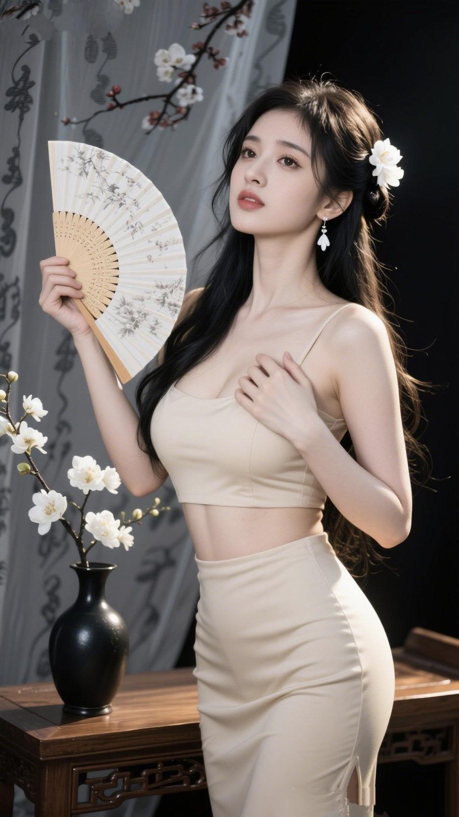 《素扇凝香》 素扇轻摇, 扇面晕开梅影清浅, 你抬首时, 眼波里盛着江南的烟。 白瓣簪在鬓边, 似雪未融,似月未眠, 耳坠的玉, 轻晃着无声的弦。 素色裹着曲线, 勾勒出东方的柔婉, 指尖抚过的地方, 是藏在骨里的缱绻。 黑瓶里的花, 与你遥遥相看, 木案上的光, 把时光揉成了一幅古卷。 你不必言语, 只这一回眸, 便让所有的风, 都慢了半拍, 让所有的诗, 都有了落款。 素衣轻舞倚楼台 淡雅之韵 素衫之韵 轻纱雅韵 素衣卧榻韵 素净雅韵 清眸雅韵 素幔书韵