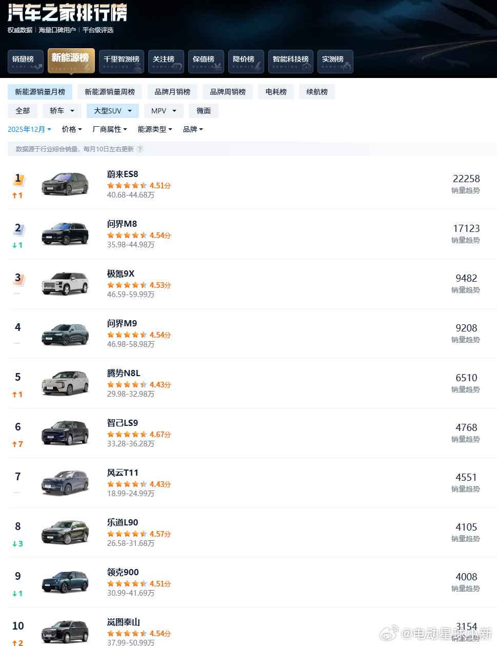 和去年 12 月相比,前四依旧是蔚来 ES8、问界 M8、极氪 9X、问界 M9,虽然排名没有变化,但是数据确有所下滑。