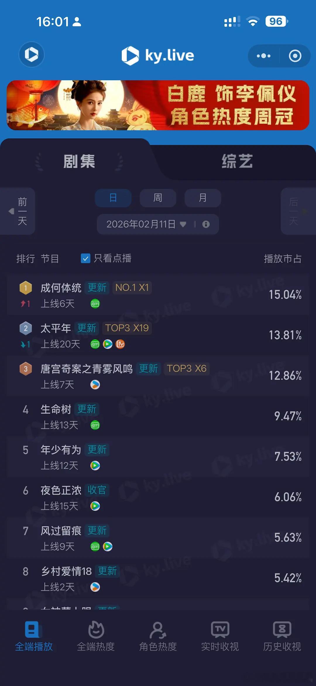 2.11酷云,成何体统15.04%,太平年13.81%,唐宫12.86%,乡村爱情5.42%