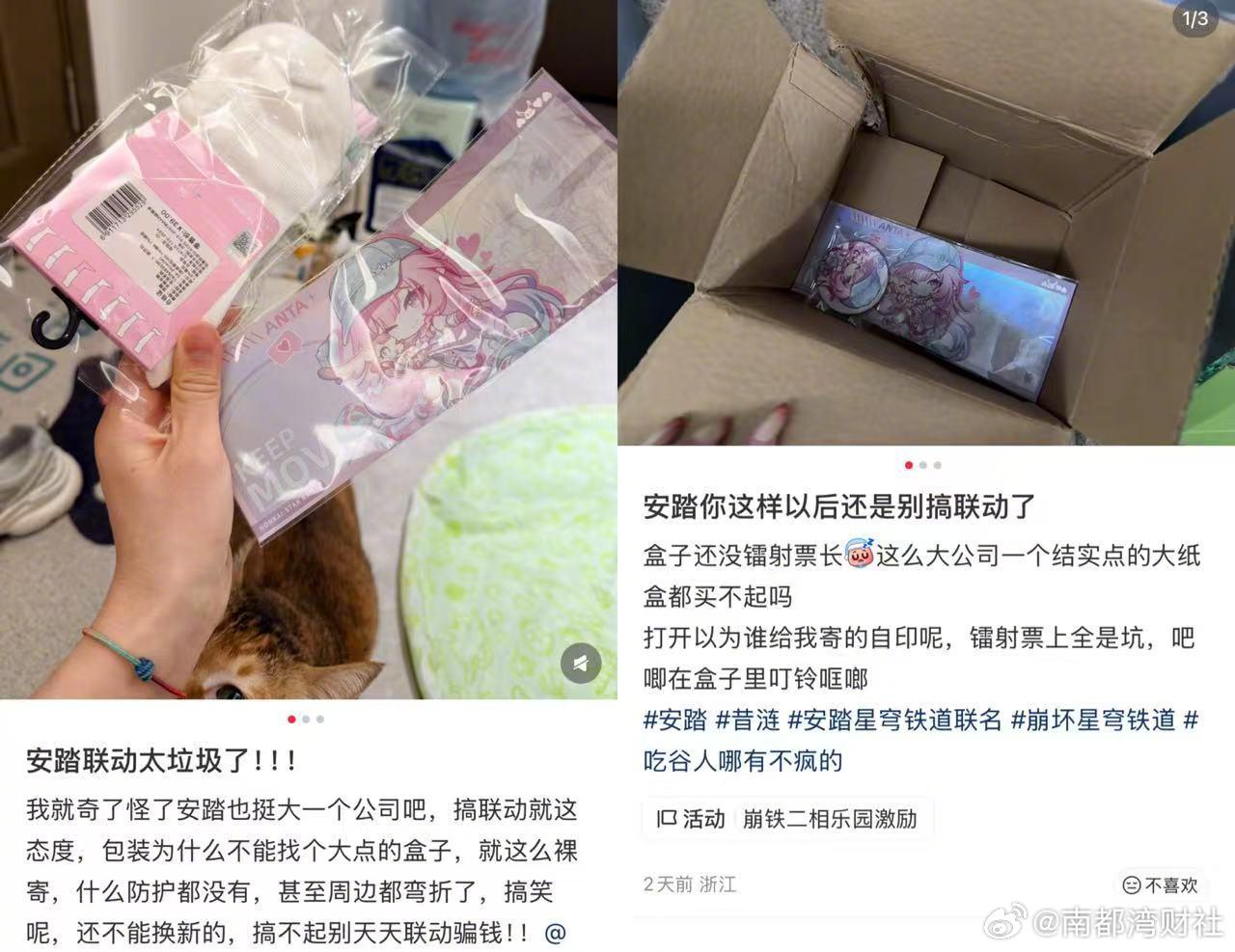 多位消费者反映称,他们在安踏官方小程序下单购买联名产品,周边镭射票与产品一起放在快递盒,但快递盒尺寸不足,导致镭射票弯折。有消费者表示,安踏此次销售的联名袜子一双39元,并不便宜,消费者为了购买周边才会买联名产品,质疑为何不能换一个更大的快递箱,提升用户体验。亦有消费者质疑,安踏选择二次元联名,应该重视周边产品,不能将周边当成赠品。