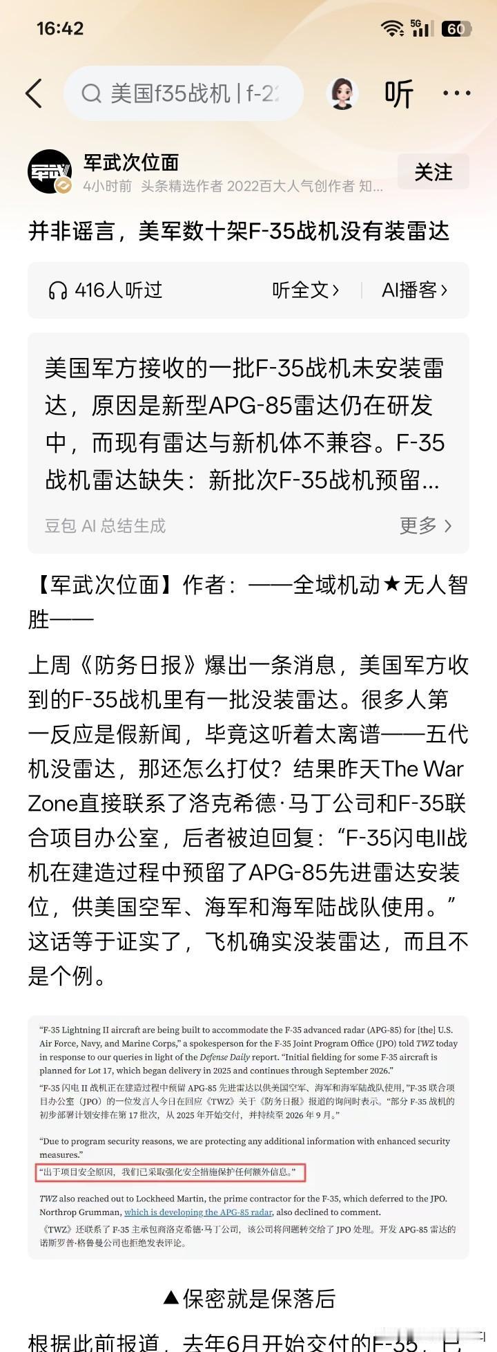 很奇怪! 美军数十架F-35隐形战斗机是否装有雷达,究竟是关一些人什么事情,为什么一直不停的在网络上吵吵嚷嚷,喳喳不休,非要搞个水落石出。 美国的战斗机上装不装雷达,别人知道不知道,美军肯定知道。而且,别人知道不知道又有什么关系? 再说,这些没有安装雷达的F-35隐形战斗机,现在又没有升空上战场去进行实际上的空战,有没有雷达其实都一样。总喜欢盯着别人,未必是个好现象。