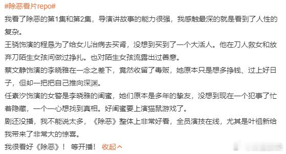 除恶还没播先看的已经急了别人看片我刷repo,馋哭了!人性犯罪+反转狂魔,任素汐王骁这阵容稳了。到底啥时候定档?我也要加入除恶大队!