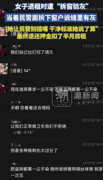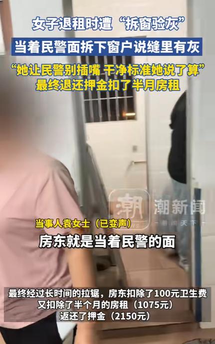 太损了!2025年3月1日深圳,一女生想退租,房东却以窗户缝隙里有灰,拒绝退钱!女生无奈报了警,没想到,房东看到民警一点不慌,民警看不下去说了几句,结果,房东还让民警不要插嘴!他还解释:不是不退钱,而是要打扫干净,干净的标准他定,只要他说不合格就是不合格! 生活在大城市里打拼的打工人,租房几乎是每个人都绕不开的必经之路,而退租时能不能顺顺利利拿回全部押金,更是无数在外漂泊的人心里最牵挂的一件事。 2025 年 3 月 1 日在深圳,就发生了一件让不少租客都感同身受又直呼离谱的退租纠纷,一位女生在正常退租交接的过程中,竟被二房东用堪称奇葩的理由百般刁难。 甚至闹到辖区民警上门亲自调解,都没能让这位房东收敛强硬态度,整件事的完整过程,说出来都让人大开眼界。 深圳作为国内流动人口最为密集的一线城市之一,常年有超过千万的外来务工、求职创业人群在此扎根生活,租房市场的整体体量常年稳居全国前列。 这位涉事的女生,早在正式办理退租前就做好了十足周全的准备,不仅严格按照租房合同里约定的时间,提前告知二房东自己的退租意向,还专门抽出整块空闲时间,对租住的房屋进行了全面又细致的深度打扫。 从客厅的地面、台面,到卧室的家具、边角,再到厨房、卫生间这些容易积脏的区域,她都逐一擦拭整理到位,房间内没有遗留任何个人杂物,地面墙面也始终保持着整洁干净的状态。 按照市面上绝大多数房东的正常验收标准,这样的房屋状况,完全符合普通退租的基础要求,女生本以为交接流程会十分顺畅,能安安稳稳拿回自己的全部押金,可现实却给了她一记猝不及防的打击。 等到二房东上门进行房屋验收时,对方全程没有检查家电是否完好可用、水电表数值是否正常、房屋基础设施有无损坏,反而径直走到房间的窗户边。 盯着窗框的细微缝隙反复打量挑剔,随后更是直接动手拆卸窗户的组件,将玻璃窗拆下来之后,指着窗框缝隙里几乎肉眼都难辨的少量浮灰,一口咬定女生没有把房屋打扫干净,态度强硬又冷漠地表示拒绝退还押金。 面对这突如其来的无理刁难,女生当场就彻底懵了,她怎么也想不到,自己把所有显眼区域都清理得干干净净,最后会被卡在窗户缝隙的一点点浮尘上,这样近乎苛刻的验收方式,完全超出了正常租房交接的基本认知范围。 女生试图心平气和地和二房东好好沟通协商,主动提出可以再次对房屋所有可见区域进行补充清洁,可对方始终咬定窗户缝隙有灰这一点死死不放,丝毫不肯做出半点退让,也不愿接受任何折中处理的方案。 双方就这样僵持了近四十分钟,女生不想白白损失自己的血汗押金,也不愿再和对方无休止地纠缠内耗,只能拿出手机拨打报警电话,请求辖区民警到场帮忙协调处理,希望能有第三方给出公平公正的处理意见。 没过多久,负责该片区的民警就快速赶到了现场,原本以为有执法人员介入调解,这场小小的纠纷能快速得到妥善解决,可这位二房东面对民警没有丝毫慌乱局促,依旧保持着强硬蛮横的态度。 民警仔细查看了房屋整体整洁状况,又看了看被强行拆下来的窗户,也觉得以窗框缝隙浮灰为由克扣押金的要求实在过于苛刻,便站在客观公正的角度轻声劝说了几句,希望双方能遵循租房市场的通用标准友好协商解决。 可让人万万没想到的是,民警刚开口劝解,二房东就直接转头生硬打断,语气不耐烦地让民警不要插嘴,全然不把执法人员的调解放在眼里,现场的气氛瞬间变得十分紧张尴尬。 随后这位二房东还当众阐述了自己的所谓专属规则,她声称自己并非不愿意退还押金,只是要求女生把房屋打扫到他满意的标准。 而这个所谓的干净标准,没有任何书面文字约定,也没有行业内的通用准则,完完全全由他个人说了算,只要他主观判定不合格,无论房屋实际状态如何,都算未达到要求。 除此之外,她还提出了更加不合常理的苛刻要求,让女生使用钢丝球用力擦洗房间和卫生间的地板。 民警在现场耐着性子调解了一个多小时,反复向二房东讲解租房交接的合理准则,明确告知其不能以个人主观标准随意克扣租客的合法押金,可对方始终固执己见,不肯做出半点让步。 最终经过长时间的拉锯协商,双方才勉强达成了一致方案,二房东同意退还女生押金,但要强行扣除半个月的房租作为所谓的清洁费用。 随着租房市场的不断规范化发展,越来越多的人开始重视租房合同的细节约定,主动留存退租交接的各类凭证。 用合理合法的方式维护自身权益,也希望这样离谱的拆窗验灰式刁难,能在租房市场里越来越少,让每一个在外打拼的租客,都能拥有安心又省心的租房体验。 对于这件事,您有什么想说的吗?欢迎评论区留言讨论。 信源:潮新闻2025-03-01——《女子退租时遭“拆窗验灰”,二房东当着民警面拆下窗户说缝里有灰,最终退还押金后还扣了半月房租》