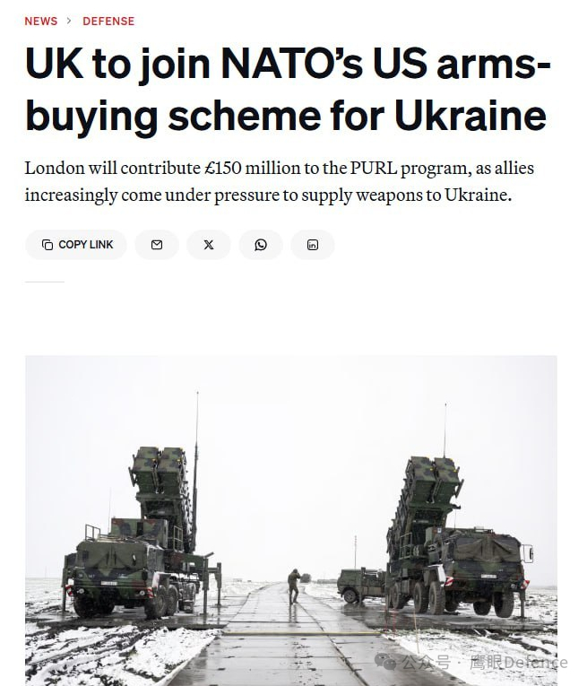 Politico的最新报道称英国刚刚加入PURL计划,英国政府准备为此提供1.5亿英镑,专门用于为乌克兰从美国购买防空武器。