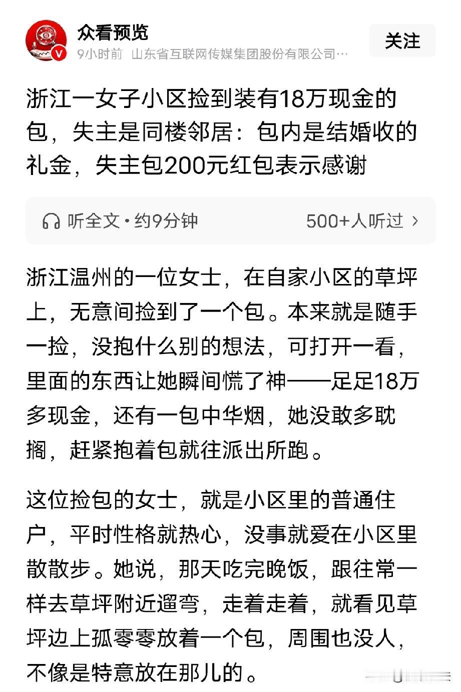 浙江温州,女子晚上遛弯消食,无意间看到草坪上有一个包,她踢了一脚感觉不对,打开一看是一捆捆的现金,她吓得抱起包撒丫子往派出所跑,民警打开一数有18万多现金,第二天,就找到了失主,说这笔钱是结婚收的礼金,为了表示感谢,失主包了200块钱给女子,热情让女子收下,接下来,女子的做法让人感动。网友不满:18万多,封200块钱红包,是不是少了点? 傍晚的夕阳西下,林大姐(化名)像往常一样遛弯消食,无意间,看到在一处不起眼的草丛边,一个暗色的手提包突兀的放在那里。 起初,林大姐心里嘀咕,谁家孩子玩累了把包丢这儿了?可当她试探性地踢了一脚,那股沉闷、瓷实的触感顺着脚尖传到心里,她瞬间觉得不对劲。 那包的拉链并没拉严,露出一包中华烟的红边。 林大姐蹲下身子轻轻一拨,里面一个黑色塑料袋由于装得太满,撑出了清晰的轮廓。 那一刻,林大姐的手心瞬间冒了汗。她小心翼翼地掀开塑料袋一角,呼吸都停滞了:那是成捆的、扎得整整齐齐的人民币,在暗影里透着诱人又危险的光。 此时的林大姐,脑子里没有一秒钟想过“发财了”,反倒是一阵阵后怕。 在这个移动支付的时代,谁会随身带着18万现金招摇过市?这可能是救命钱,也可能是刚取出来的血汗钱。她几乎是小跑着冲向了派出所,把这个“烫手山芋”交到了民警手里。 与此同时,住在同一栋楼的失主早已乱成了一锅粥。 那18万块钱,是儿子刚办完婚礼收的礼金,失主的母亲本想把礼金带回老家存起来。 可那天早上,她等车时一分神,包就落在了草坪上。直到到了车站,手心一空,老太太整个人都瘫了。 失主一家那一夜是绝望的,在这繁华的小区里,人来人往,谁要是捡走这笔钱往怀里一揣,只要没监控拍到,基本就是石沉大海。 这18万不仅是钱,还是儿子小家的支撑,更是亲友的祝福。 第二天,当民警通过监控和信息核对联系到失主时,他们简直不敢相信自己的耳朵。更巧的是,捡包的林大姐,竟然就住在他们家楼下。 失主登门致谢时,场面其实挺耐人寻味。她攥着一个红包,激动地对林大姐说:“太谢谢你了!要是没有你,这18万可真就找不回来了。” 随后,失主把红包塞给林大姐,可林大姐是一个热心肠,她做好事也从不奢求回报,自然推脱拒绝。 可失主还是诚恳的说,红包里有200块钱,不是多贵重,你就收下吧,一点心意,是我们一家人对你的感谢。 林大姐实在是盛情难却,谦虚的说:“我做的是小事,不需要感谢,换谁都会这么做,不是自己的东西,坚决不能要。”几番推辞之下,还是收下了200块钱红包。 很多人看到这儿可能会议论:18万找回来了,才给200块?是不是太小气了? 但在林大姐看来,这200块钱接得踏实。对于普通家庭来说,200块是个心意,是邻里之间既表达了感激,又不至于让对方觉得这是在“买卖道德”。 如果失主拿出一两万来谢,这事儿反而变了味,倒像是林大姐为了赏金才还钱似的。 林大姐坚守的是不属于我的,一分也不动的以及不求回报底线。 失主拿出200块钱红包也是表达了自己的心意,不过,失主和林大姐家也算邻居,事后,她又特意上门给林大姐送了水果,表示感谢,还说以后林大姐有什么要帮忙的,尽管吱声。 林大姐笑着答应了,心里也是暖暖的。 有人说,200块钱太少了吧!起码得包个是1000-2000元钱的红包,收不收是人家的事。至少是自己诚挚谢意的表示,若是碰上一个贪财的人匿下了,谁敢保证一定能找回来?那可是18万呢! 最少上千元感谢好心人,好心人人品高尚,拾金不昧满满的正能量。 从法律方面来说,捡到这18万是一定要归还失主的不然构成不当得利。 林大姐捡到巨额现金,第一时间没有据为己有,而是及时送往派出所,这符合法律对拾金不昧的要求。 林大姐收下这200元是挺体面的结局。 失主一家真心想表达感谢,这200元是他们的心意,若林大姐坚决不收,失主心里会一直过意不去。 收下红包,既让失主一家安心,也体现了对这份感激的尊重。 而且,这200元并非报酬,而是邻里间情谊的象征。它见证了林大姐的善良,也拉近了两家人的距离。 邻里间本就该互相照应,这份温暖会在小区里传递,让社区更有温度,所以收下是合情合理的。