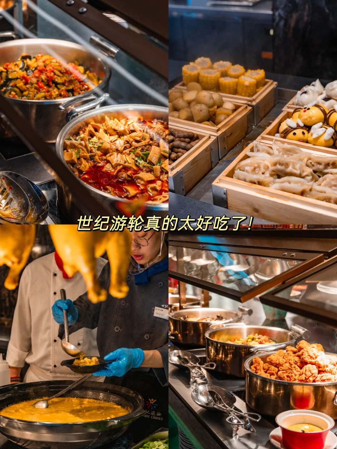 世纪游轮的餐食我一直很爱!这次依然没让我失望,菜式特别丰富,川菜、海鲜、轻食、西点、水果应有尽有,2楼到4楼都有餐厅,每天换着花样吃,味道也很在线~闺蜜直呼“这趟值了!”