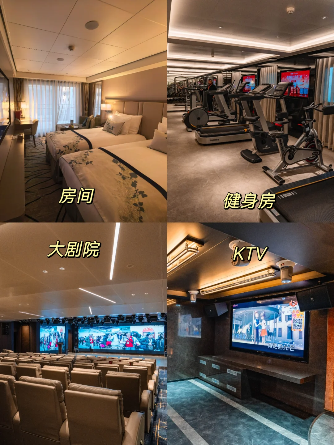 足足有7层,夹板在顶层,往下有客房、餐厅、剧院、酒吧、SPA、KTV、健身房、商店等等,阳台房可以看到江景,在船上就可以“躺平”度假。