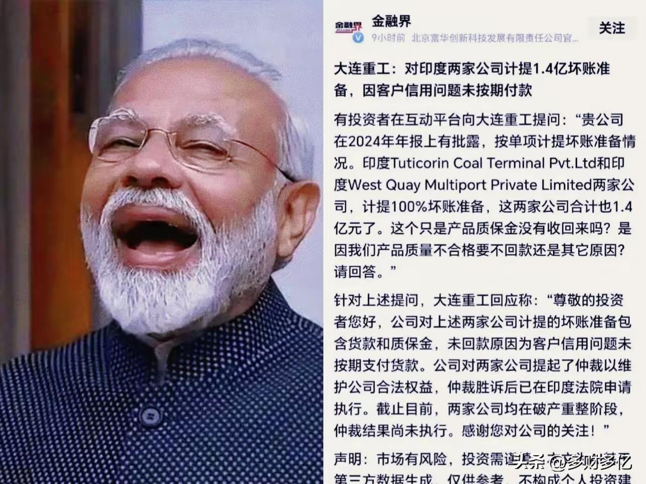 1.4个亿,说没就没了,大连重工这哑巴亏吃得太憋屈。 官司打赢又怎样?对方直接申请破产重整,胜诉裁决瞬间成了一纸空文。 货款赖掉,质保金也全吞,这招“金蝉脱壳”,在某些海外市场玩得炉火纯青。 别以为只是大连重工运气差。 立讯精密、闻泰科技,都是行业巨头,在印度市场同样踩过大坑:资产被查封、交易黄掉、上亿资金陷入仲裁纠纷。 这不是偶然,是跨国生意的系统性风险。 大连重工遇到的不是普通生意纠纷,而是被人精准利用当地破产规则,把合法债权直接架空。 哪怕流程走到底、判决拿到手,也挡不住对方用程序操作,让胜诉结果落不了地。 当地的破产执行机制被钻了空子,外来企业的债权在重整流程里几乎没有话语权。 1.4亿资金直接计提坏账,对重工企业而言,是实打实的利润与现金流损失。 立讯精密、闻泰科技的上亿资金纠纷,同样卡在当地市场的规则不确定性上。 资产被查封、过户办不下来,好好的商业交易被迫终止,钱陷在里面进退两难。 这些接连发生的案例说明,风险不是个案,而是部分海外市场自带的结构性问题。 政策波动、执法弹性、规则漏洞,叠加在一起,对外资格外不友好。 中国企业走出去,早已过了只看订单、只算毛利的阶段。 不把法律风险、属地合规、信用兜底做到位,再大的巨头也可能栽跟头。 真正稳妥的出海,不是盲目抢市场,而是先把风险墙筑起来。 信用保险、第三方监管、国际仲裁约定,每一项都能少踩一点坑。 全球化从来不是一帆风顺,机遇背后藏着的陷阱,往往更致命。 只有把风控做在投资前面,才能守住辛苦打拼下来的成果。 这些海外生意的隐形坑,你觉得企业最该先防范哪一点?