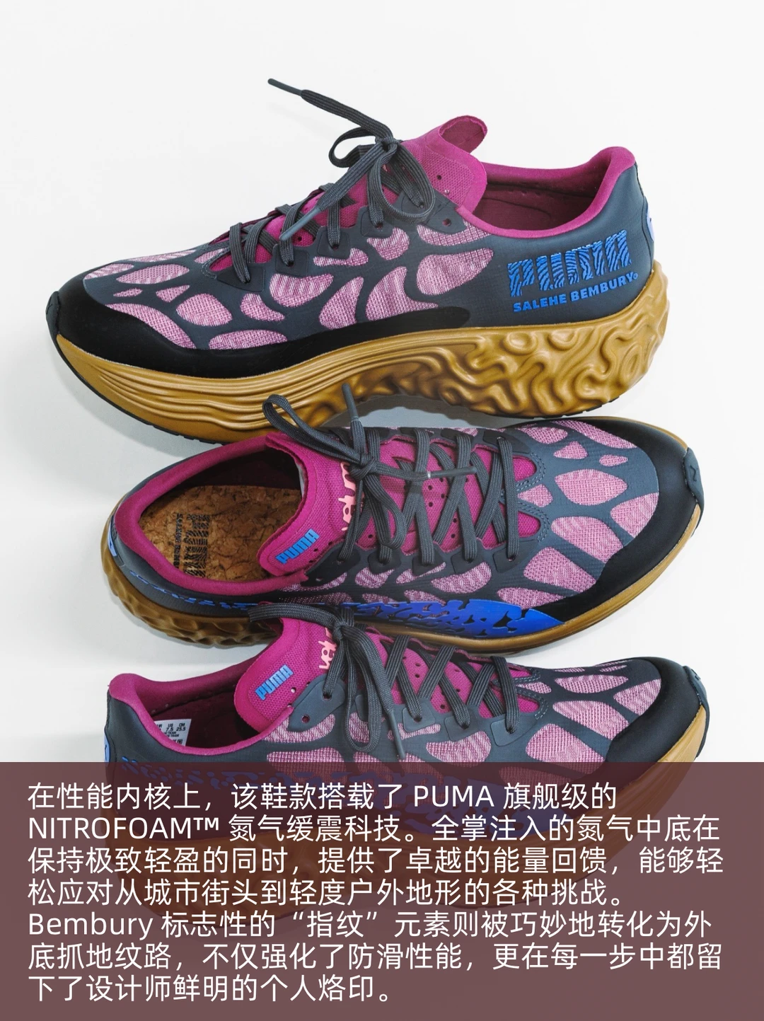 在性能内核上,该鞋款搭载了 PUMA 旗舰级的 NITROFOAM™ 氮气缓震科技。全掌注入的氮气中底在保持极致轻盈的同时,提供了卓越的能量回馈,能够轻松应对从城市街头到轻度户外地形的各种挑战。Bembury 标志性的“指纹”元素则被巧妙地转化为外底抓地纹路,不仅强化了防滑性能,更在每一步中都留下了设计师鲜明的个人烙印。