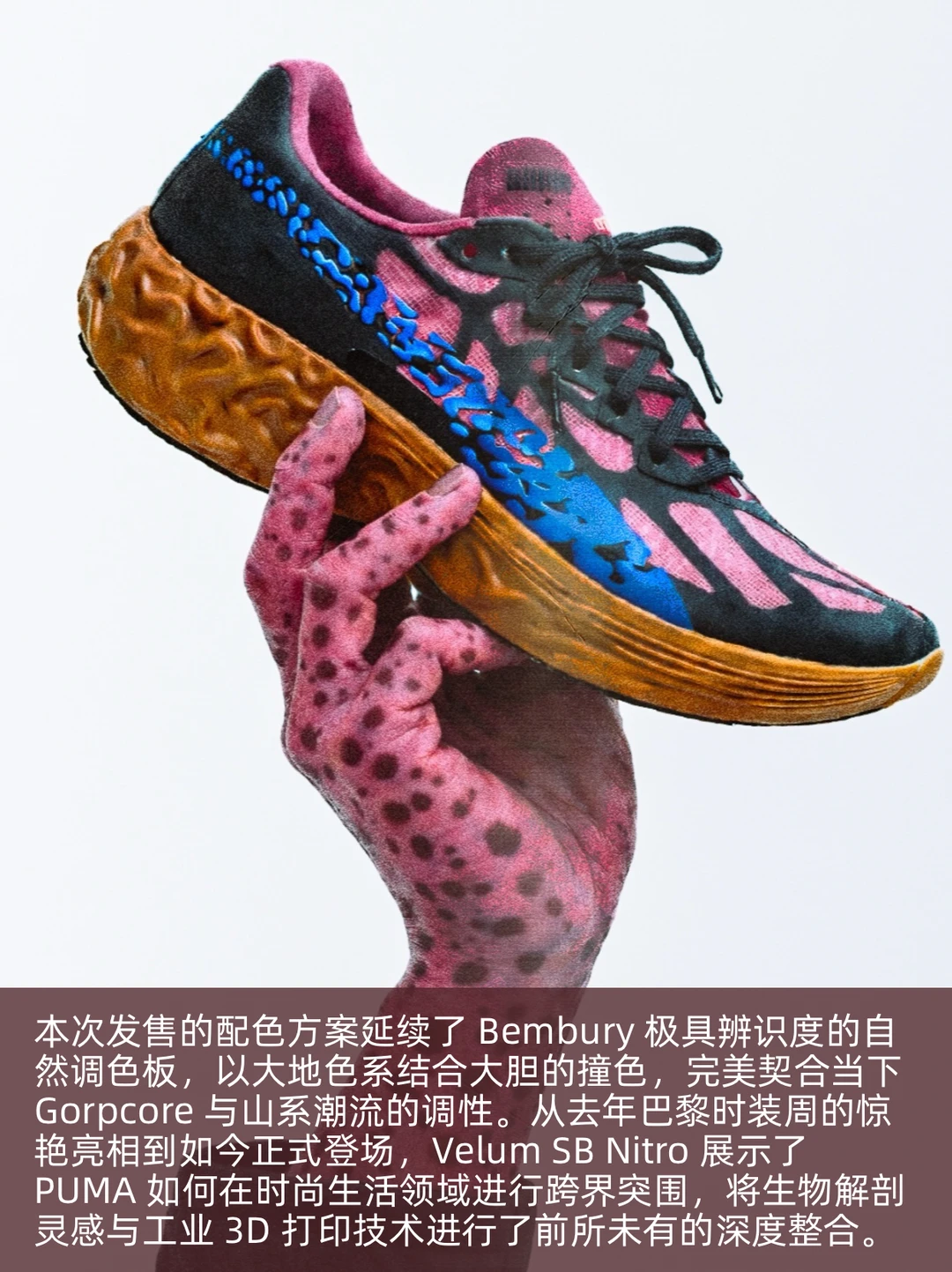 本次发售的配色方案延续了 Bembury 极具辨识度的自然调色板,以大地色系结合大胆的撞色,完美契合当下 Gorpcore 与山系潮流的调性。从去年巴黎时装周的惊艳亮相到如今正式登场,Velum SB Nitro 展示了 PUMA 如何在时尚生活领域进行跨界突围,将生物解剖灵感与工业 3D 打印技术进行了前所未有的深度整合。