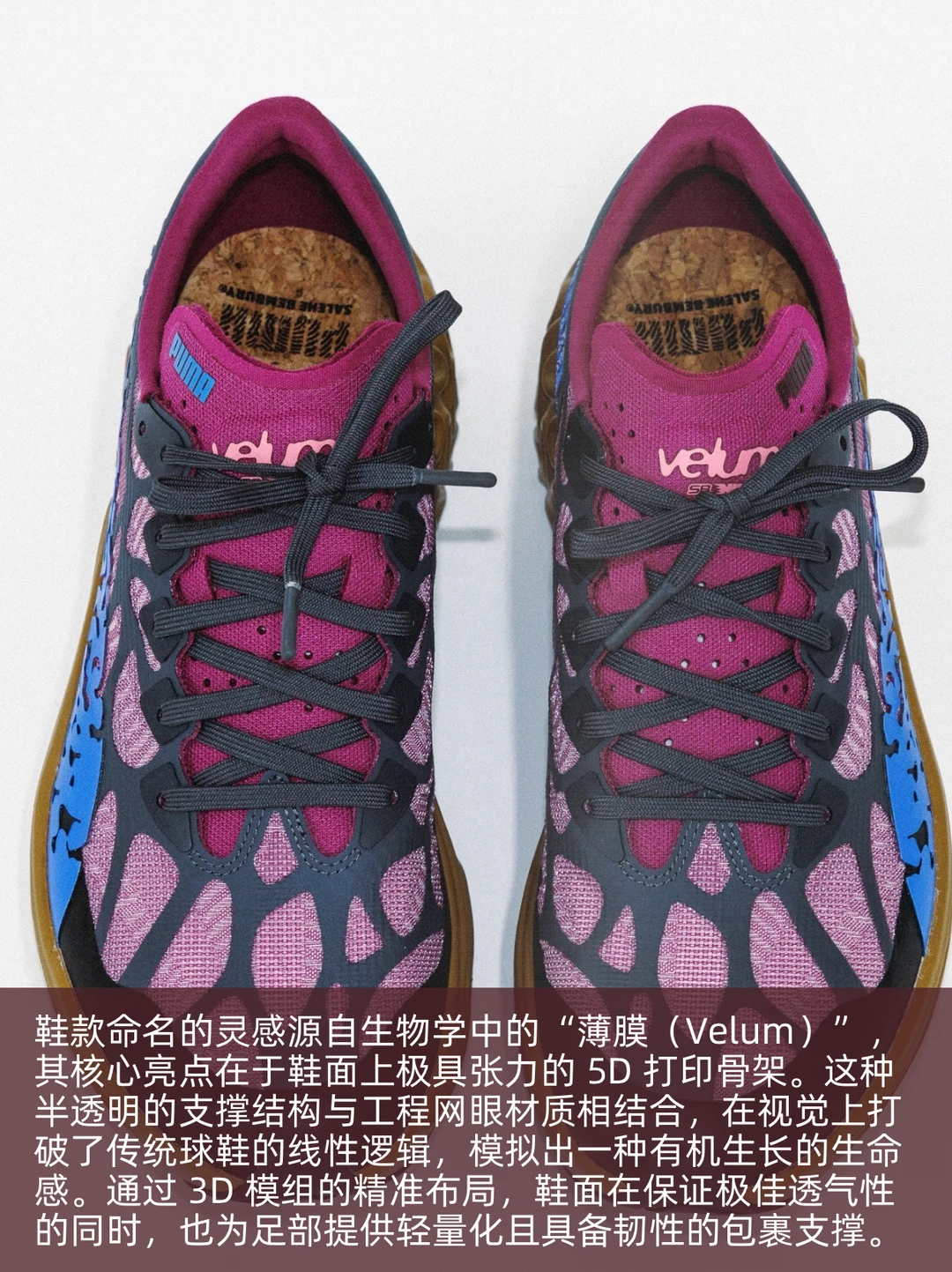 鞋款命名的灵感源自生物学中的“薄膜(Velum)”,其核心亮点在于鞋面上极具张力的 5D 打印骨架。这种半透明的支撑结构与工程网眼材质相结合,在视觉上打破了传统球鞋的线性逻辑,模拟出一种有机生长的生命感。通过 3D 模组的精准布局,鞋面在保证极佳透气性的同时,也为足部提供了轻量化且具备韧性的包裹支撑。