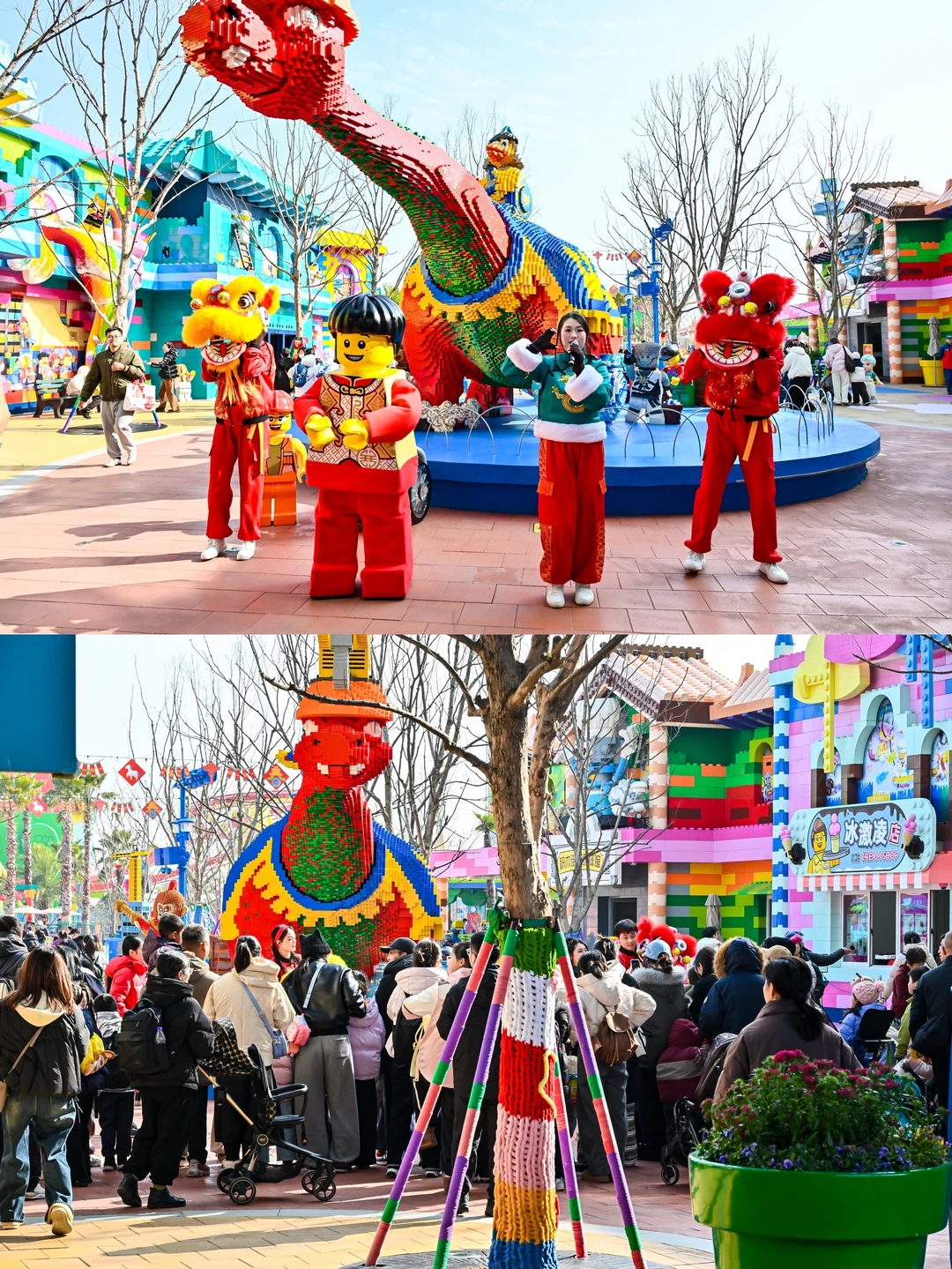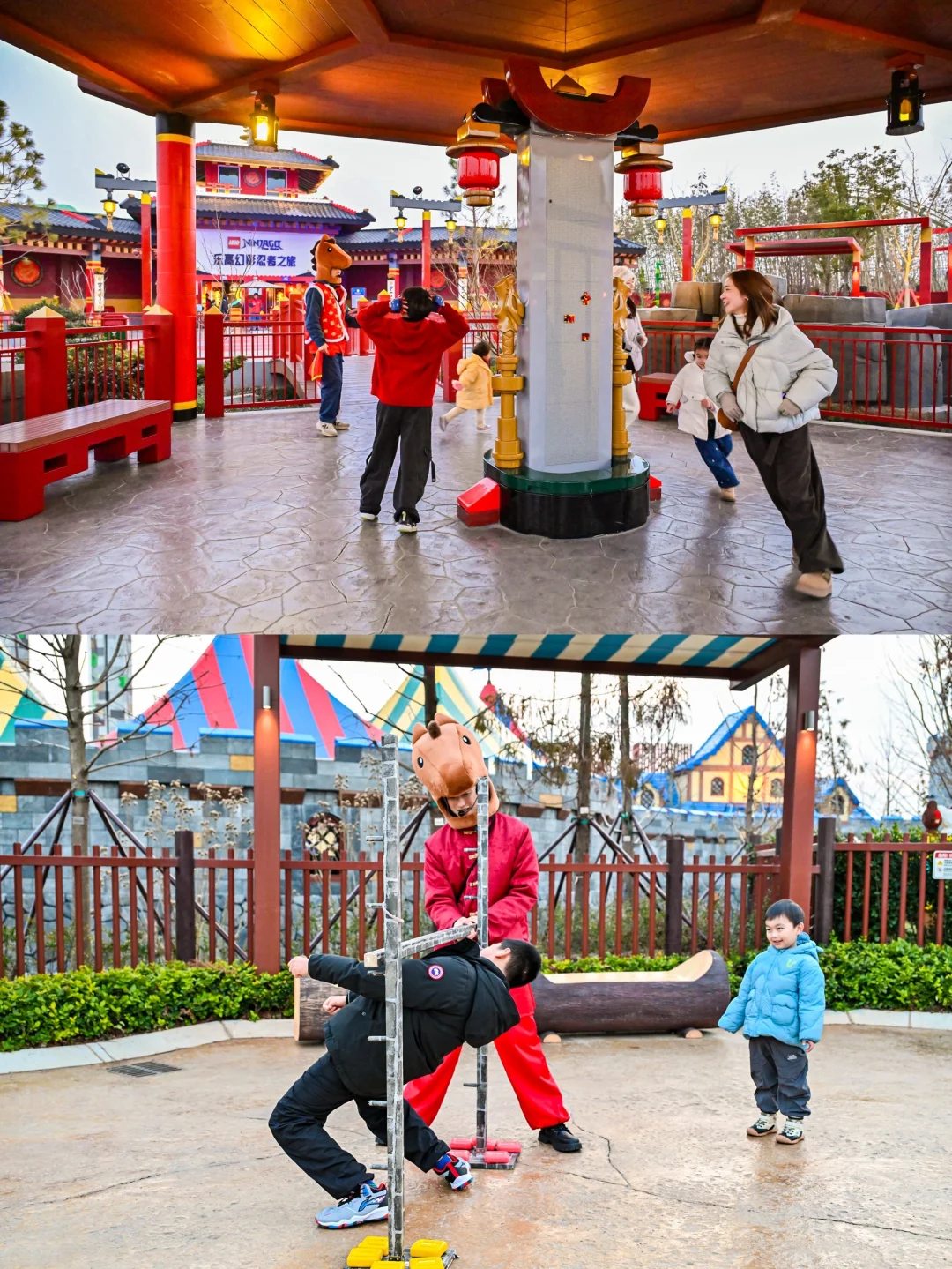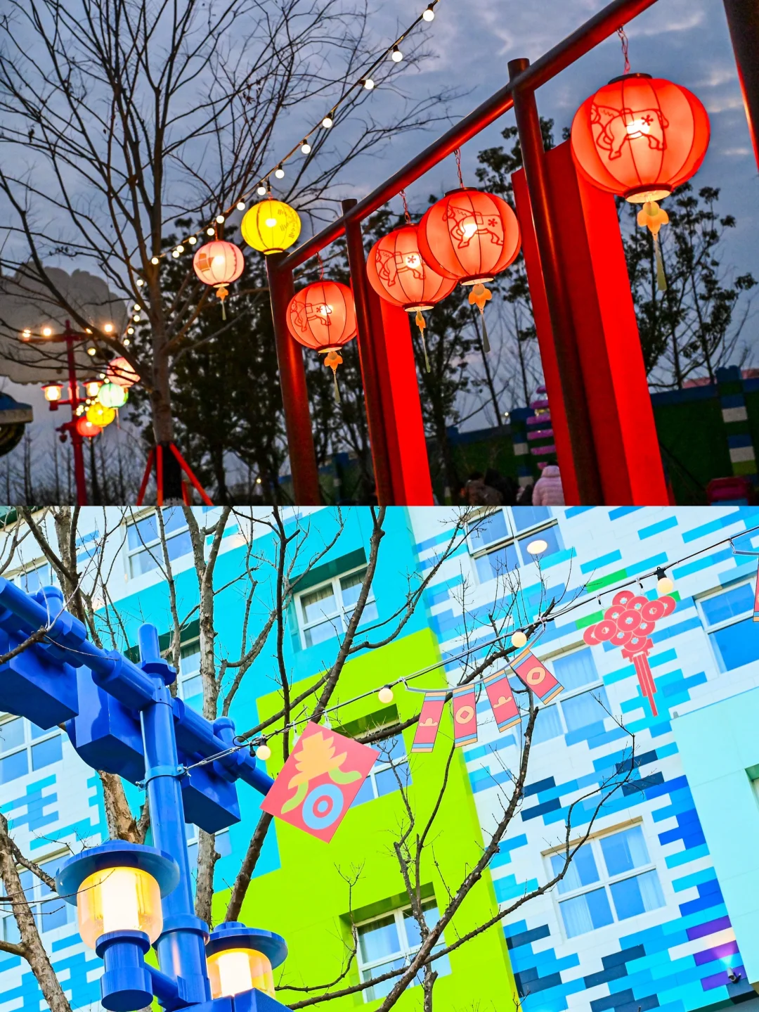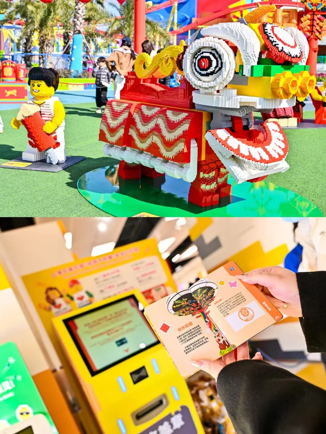 重头戏!在乐高广场,看到那个四五米高的鞭炮骨架,娃直接“哇”出声。工作人员发给我们红色积木,指着一块区域说:“来,这一片归你们家!”