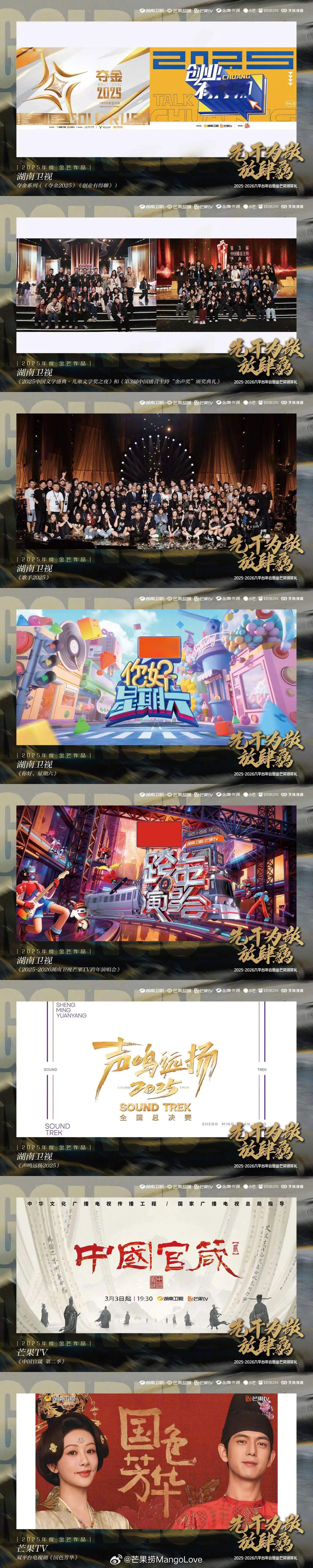 芒果六平台2025年度金芒作品:夺金2025、创业有得聊、儿童文学奖之夜、金声奖颁奖典礼、歌手2025、你好星期六、2026跨年演唱会、声鸣远扬2025、中国官箴第二季、国色芳华、花儿与少年同心季、巴黎合伙人、乘风2025、妻子的浪漫旅行2025、坐标、大侦探拾光季、姜颂