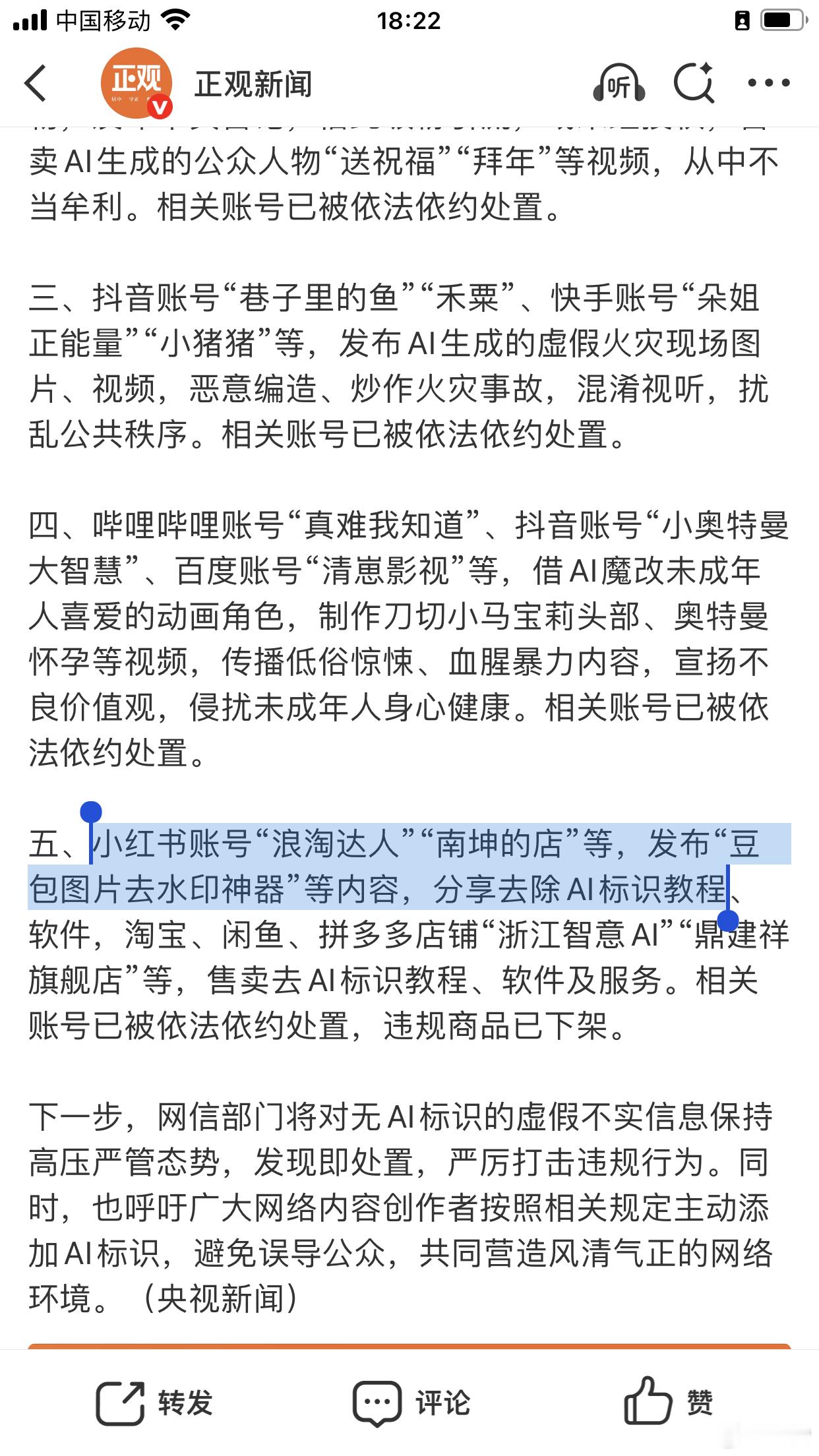 三、抖音账号“巷子里的鱼”“禾粟”、快手账号“朵姐正能量”“小猪猪”等,发布AI生成的虚假火灾现场图片、视频,恶意编造、炒作火灾事故,混淆视听,扰乱公共秩序。相关账号已被依法依约处置。