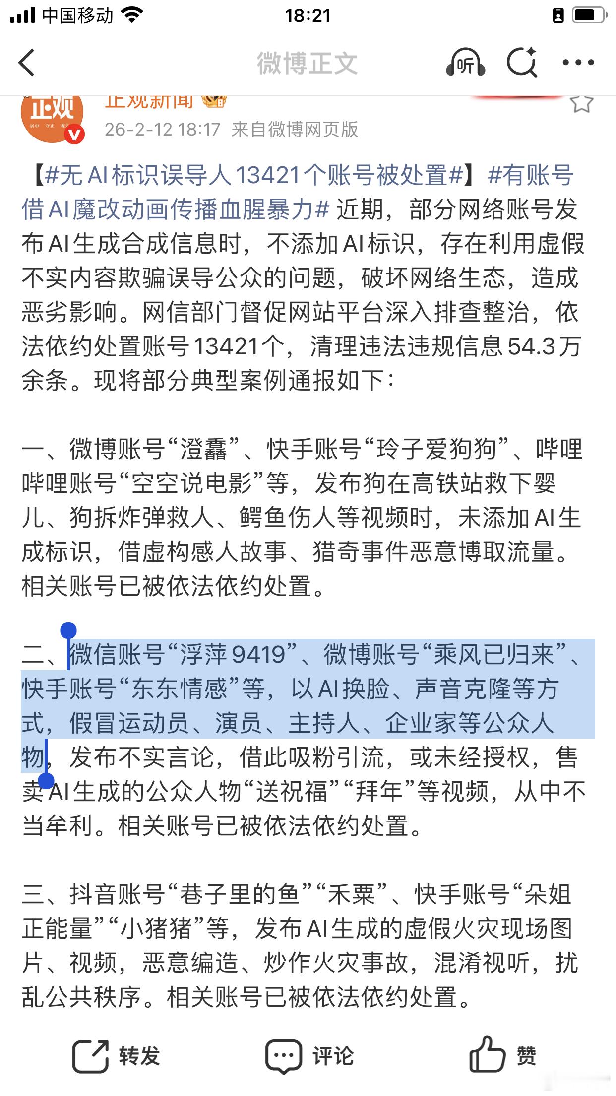 二、微信账号“浮萍9419”、微博账号“乘风已归来”、快手账号“东东情感”等,以AI换脸、声音克隆等方式,假冒运动员、演员、主持人、企业家等公众人物,发布不实言论,借此吸粉引流,或未经授权,售卖AI生成的公众人物“送祝福”“拜年”等视频,从中不当牟利。相关账号已被依法依约处置。
