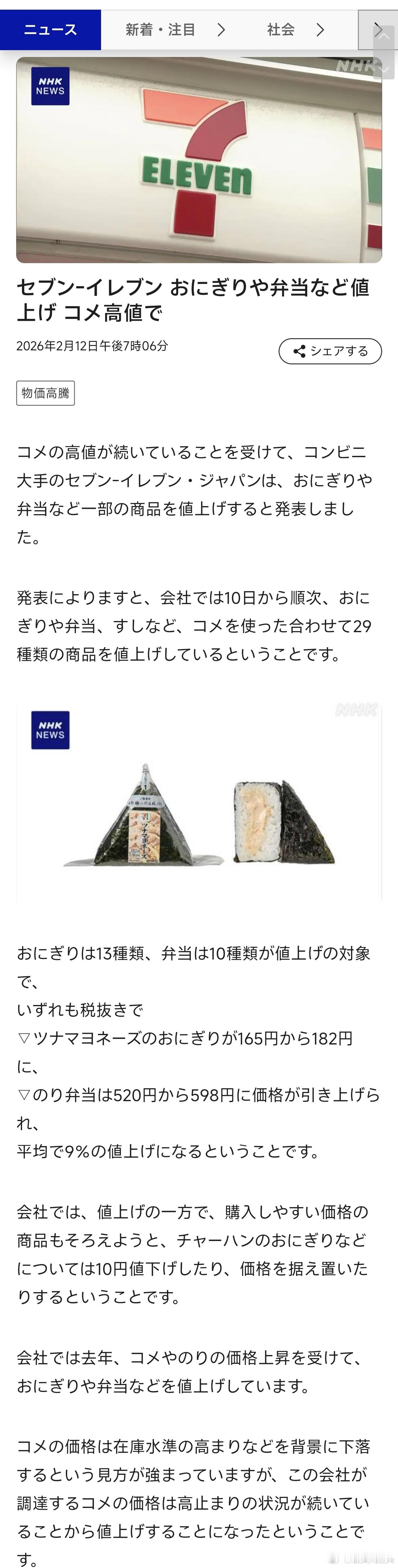 寰球镜头受大米持续高价影响,日本便利店巨头7-11 宣布,将提高饭团和便当等一部分商品的价格。