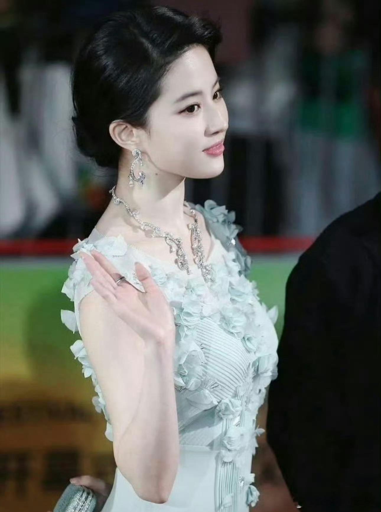 配饰上,她选择了一套奢华钻石珠宝,璀璨夺目,与淡雅裙装形成鲜明对比,完美平衡了清新与贵气。这组照片出自正式的红毯或颁奖礼场合,刘亦菲置身于聚光灯下,从容挥手致意,或在人群中缓步前行,尽显公众人物的专业素养与沉静气质。