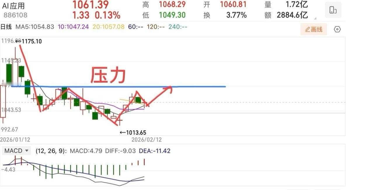 2026.2.12周四收评: 节前最后一个交易日,有没有红包行情?关键看它。 大盘指数延续窄幅震荡,主要是资金也不愿意大动干戈了,所以波动很小,基本上打破僵局大概率要等到年后了。从指数的角度来看,当前处于变盘选择方向的阶段,是往上去挑战4190?还是往下再去考验下轨?就看下方短期均线得失,目前来看向上的概率还是比较大的,这里唯一的条件就是不破5/10/20日线,那么就有机会继续震荡向上。 指数方面,大家不需要过度担心,中线逻辑整体方向是不变的,尤其是下方的60日线,已开始向上发散,包括节后都是如此,这个就是均线的支撑预期,所以整体持股过节问题不大,仓位不要太满就行,半仓都是可以的。 板块方面,我个人还是相对看好AI应用,一方面是最近的热点,一方面也是未来的趋势,包括AI相关产业方向,像算力、AI芯片等等。,但不要去追涨,回调还是可以看看的。   《AI应用》大家可以看一下它的走势结构,从高点下来,走了个abc调整结构,或者说c段走势背驰回拉中枢,像不像是一个头肩底部形态?当然目前只是一个“雏形”,只有突破压力才算,但有一点样子出来了,能否走出来的关键,在于下方的10日线不能破,不破才有机会再去挑战上方压力线,目前还只能当作震荡,不过我个人还是相对看好,走势可以一步步跟踪,当然要做的就是选股跟踪,等待机会。 个人观点,仅供参考!不作为投资建议!