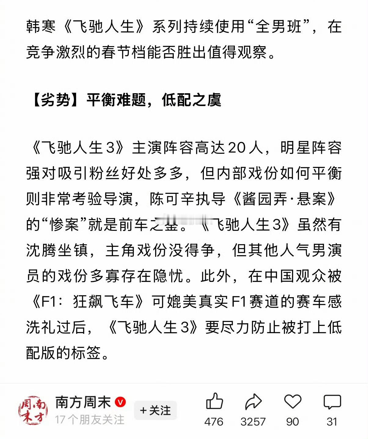 南方周末写道,韩寒为《飞驰人生》系列体现的最大魄力就是“全男班”,三部电影都没有女性角色,在风生水起的女性题材潮流面前独树一帜。