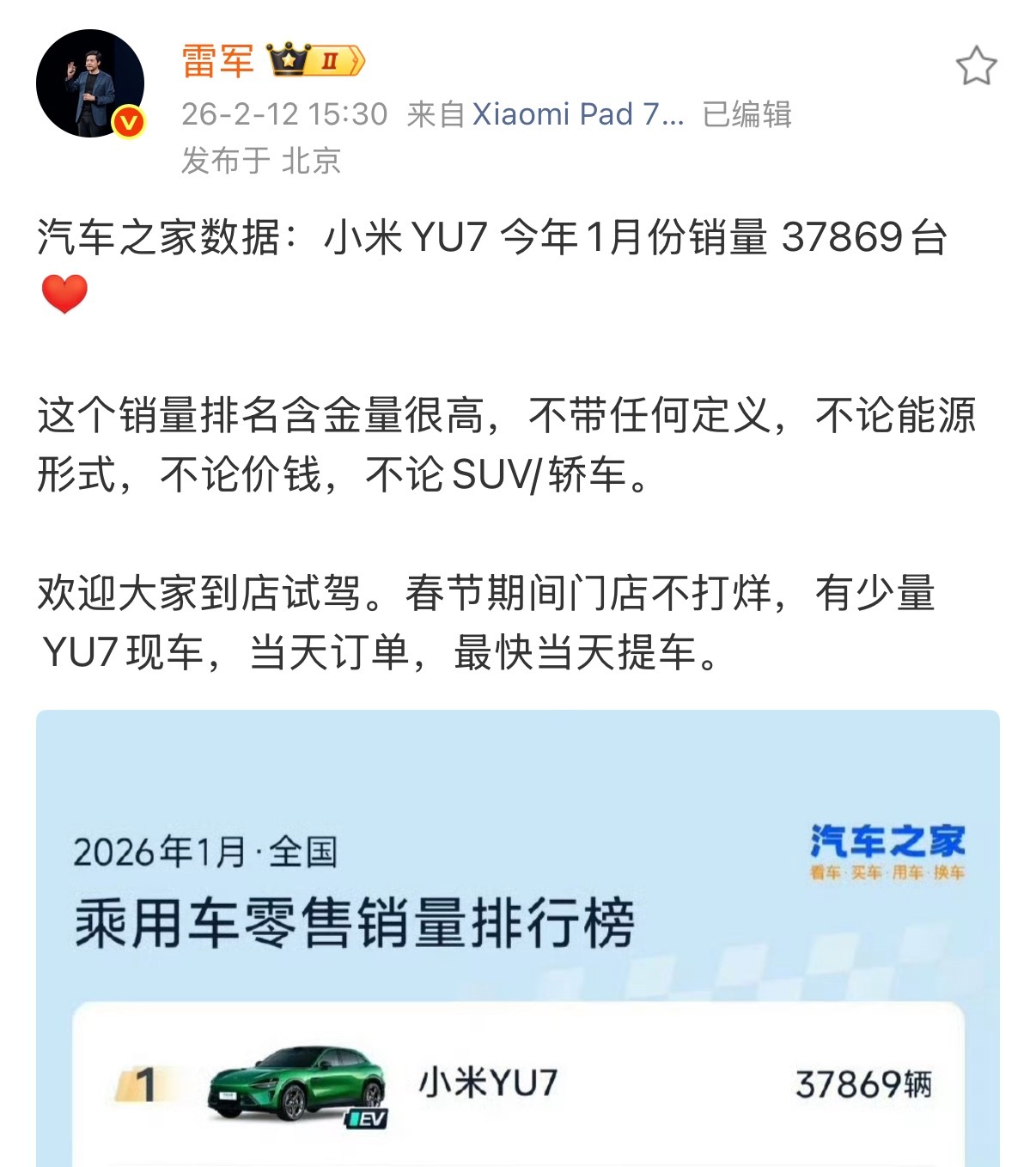 YU7能卖这么好是产品力和价格都戳中了痛点,也是国产新势力又一次刷新了大家的认知。雷军回应YU7登1月销量榜首