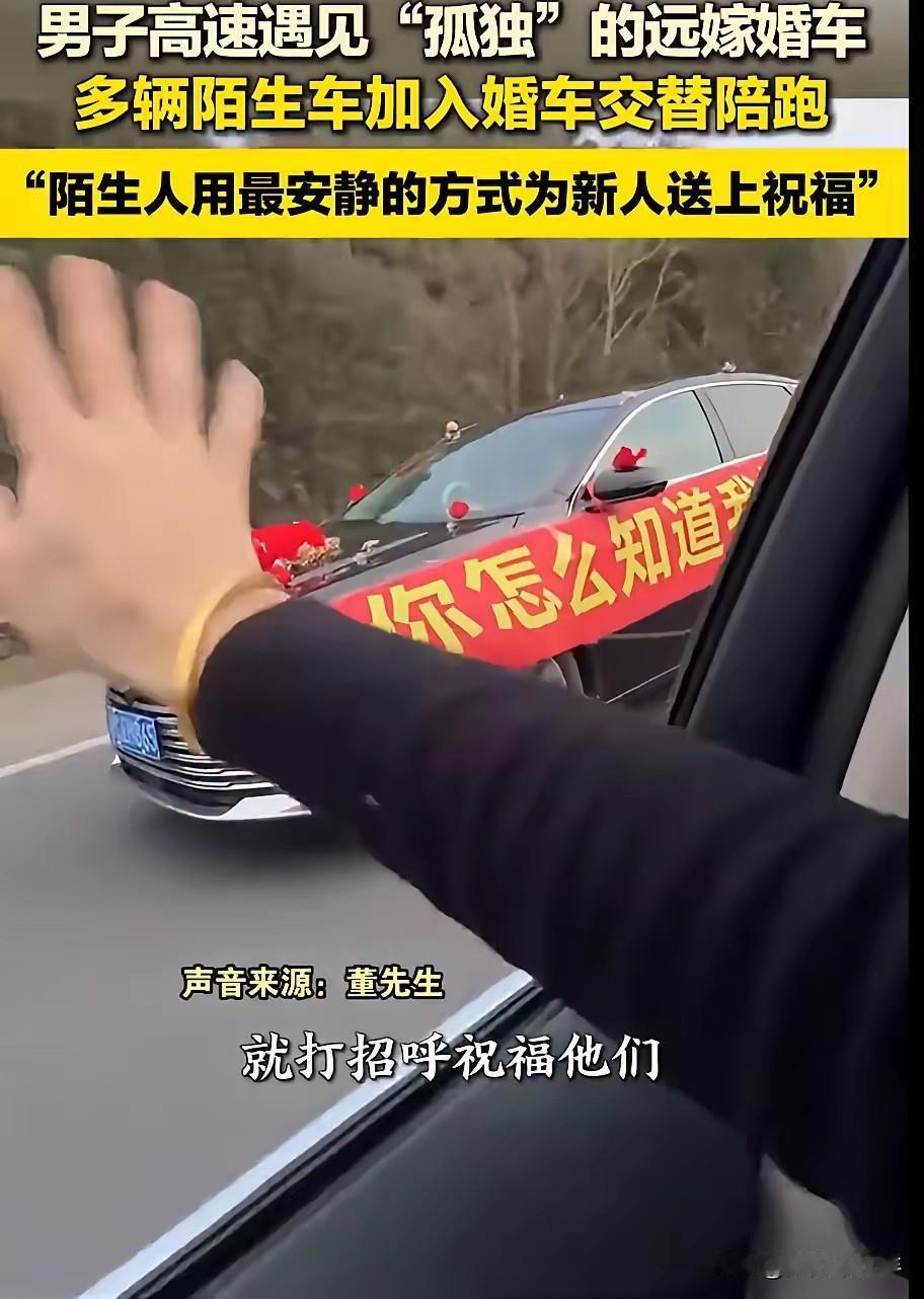 看哭了!上海,一男子开车上高速,突然在路上发现一辆远嫁的“孤独婚车”,没有车队,只有新郎默默开着车拉着新娘,而让人感动的是,高速路上很多陌生车辆看到后都不约而同的加入婚车交替陪跑,让这段路不再变的孤独。 2月11日,上海高速上,董先生驾车途中偶遇一辆婚车。该车车身贴有喜字,横幅写着“怎么知道我把李婷娶到了”,但无随行车队,仅新郎独自驾驶。 董先生见状,主动减速跟行。随后,多辆途经车辆陆续加入,形成临时车队,交替陪跑。全程无鸣笛、无喊话,仅通过手势、短按喇叭等方式传递祝福。 董先生表示,此举让他深受触动。他回忆,自己当年结婚也曾因车队走散感到孤单,而此次陌生人的陪伴,让他看到了人性的温暖。 有观点认为,这是“中国式浪漫”的体现。在缺乏仪式感的场景下,陌生人用低调、默契的行动,为新人送上祝福,这种纯粹的善意更具感染力。 也有声音指出,高速陪跑存在安全隐患。随意跟车、变道易引发事故,浪漫行为需以遵守交通规则为前提。此外,部分网友质疑事件存在炒作嫌疑,认为刻意安排的车队会削弱事件的真诚性。 从社会层面看,此类事件并非个例。此前,高速上为救护车让行、为故障车辆提供帮助等场景,均展现了陌生人之间的互助精神。这些行为虽非惊天动地,却构成了社会温暖的底色。 在快节奏的当下,人情冷漠常被提及。而该事件提醒人们,善意从未缺席。它以小见大,证明即使在陌生环境中,个体仍能通过微小行动传递温度。 从传播角度看,事件的走红也反映了公众对真诚善意的渴望。在流量至上的环境中,这种不掺杂功利的行为,更易引发情感共鸣。 需要明确的是,表达善意需兼顾安全与合规。高速行车中,任何影响交通秩序的行为都应避免。若想表达祝福,可选择在服务区等安全区域,以更稳妥的方式传递心意。 无论争议如何,该事件已成为2026年初的暖心热点。它让人们相信,即使在最孤独的时刻,也有人愿意伸出援手,陪你走过一段路。 各位读者你们怎么看?欢迎在评论区讨论。