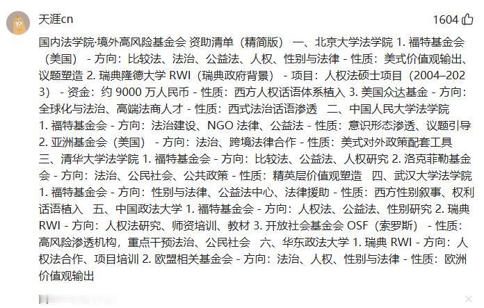 胡锡进和项立刚杠起来了。 来吃瓜。 胡锡进用了一个很严厉的词,指控。 项立刚认为现在国内法律界必须要整顿,因为西方道德价值观已经渗透进我们的立法了。 而胡锡进则不这样认为。 他们说的好像都有道理。 但是看看图四,我们看到的事实是……有几起轰动的女拳性别对立事件都和武汉大学有瓜葛。而武汉大学法学院接受福特基金会的资助,研究的方向正好是性别与法律。 前段时间关于吸毒等违法记录封存的问题,专家来自于北京大学,福特基金会资助方向是人权等。 那么问题来了,这是巧合,还是真的渗透? @胡锡进能不能解释一下? 点右上角关注我,我们一起去看这个魔幻的世界