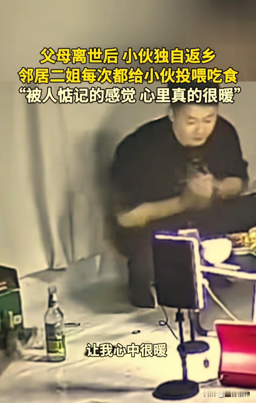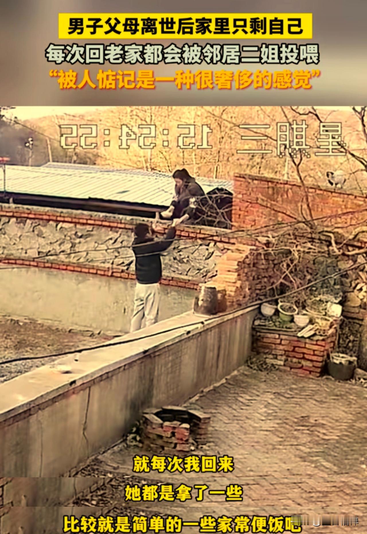 父母离世后,辽宁小伙每次回老家,都被邻居二姐这样“投喂”:原来家的温暖,从未走远 近日,在辽宁的一个小村庄里,有个小伙的故事,戳中了无数人的心。 父母离世后,老家的房子就只剩下他一个人。每次从外地风尘仆仆赶回来,推开那扇熟悉的门,屋里总是冷清清的,连个说话的人都没有。 监控里的画面,看得人鼻酸:二姐站在矮墙上,小心翼翼地把一碗热乎的饭菜递过来,小伙双手去接。虽然都是一些家常便饭,但他说,心里很暖,被人惦记的感觉真好。 小伙说,因为家里的特殊情况,就剩下他一个人了。每次从外地回到农村老家,邻居二姐都会给他“投喂”。二姐是从小看着他长大的。 常言道:父母在,人生尚有来处。其实我们每个人逢年过节能回的那个老家,推开那扇门,无论你赚不赚钱,总有人嘘寒问暖,不管你结没结婚,总能听到有人唠叨。 父母不在了,老家就成了故乡,回去也是客了。房子还在,门还能推开,但心里知道,那已经不是家了。父母和家之间的那道门,只要开着,你就永远有地方可回。 在这个快节奏的时代,我们总在追逐远方,却常常忽略了身边最朴素的温暖。它不是什么惊天动地的大事,只是一碗热饭,一句问候,一份藏在日常里的惦记。只要有人惦记你,家就永远在。 就像网友说的:“这哪是送饭啊,这是在帮他爸妈,继续爱他。”