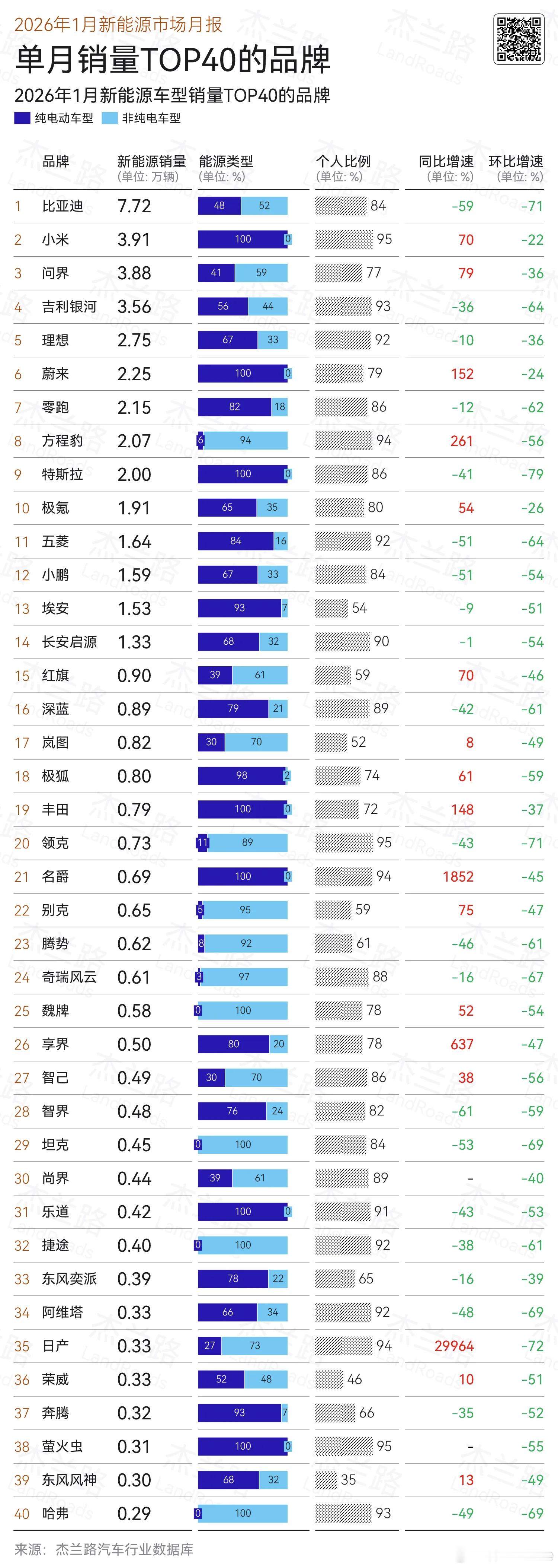 小米YU7不仅仅是一月销量冠军,更是凭一台车超过了任一单一品牌的1月纯电车型销量总和。