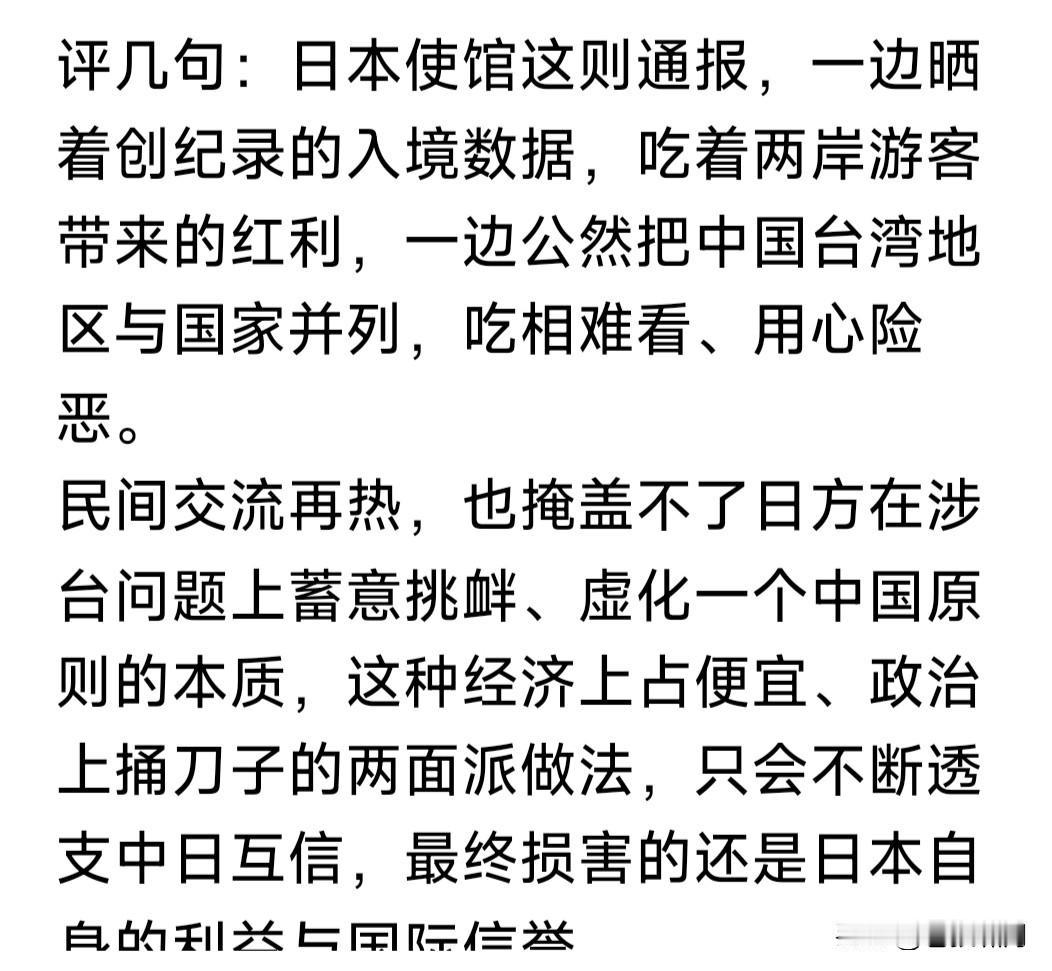 日驻华使馆发布2025外国入境人数!前三名韩国923万,中国大陆722万,中国台湾669万。总计4243万人。 若中国大陆与台湾加一起,就是1645万人,占旅日总人数的39%!可见日本仍是中国人旅游最佳选择地之一。 关键是日本驻华大使馆,发布这个数据是什么意思?网友指出:日本一边吃着中国大陆与台湾游客红利,一边在台湾问题上伤害中国,用心何其险恶? 但我们是否也应反向思考:为何这么多大陆与台湾人赴日旅游?日本人里面是否也有不少人,希望中日友好呢? 这次高市发表不当言论,日本国内就有不少人批评。也有党派联合阻击高市,虽然失败,但说明日本友好人士依然不少。这是化解矛盾合作发展的基础! …………
