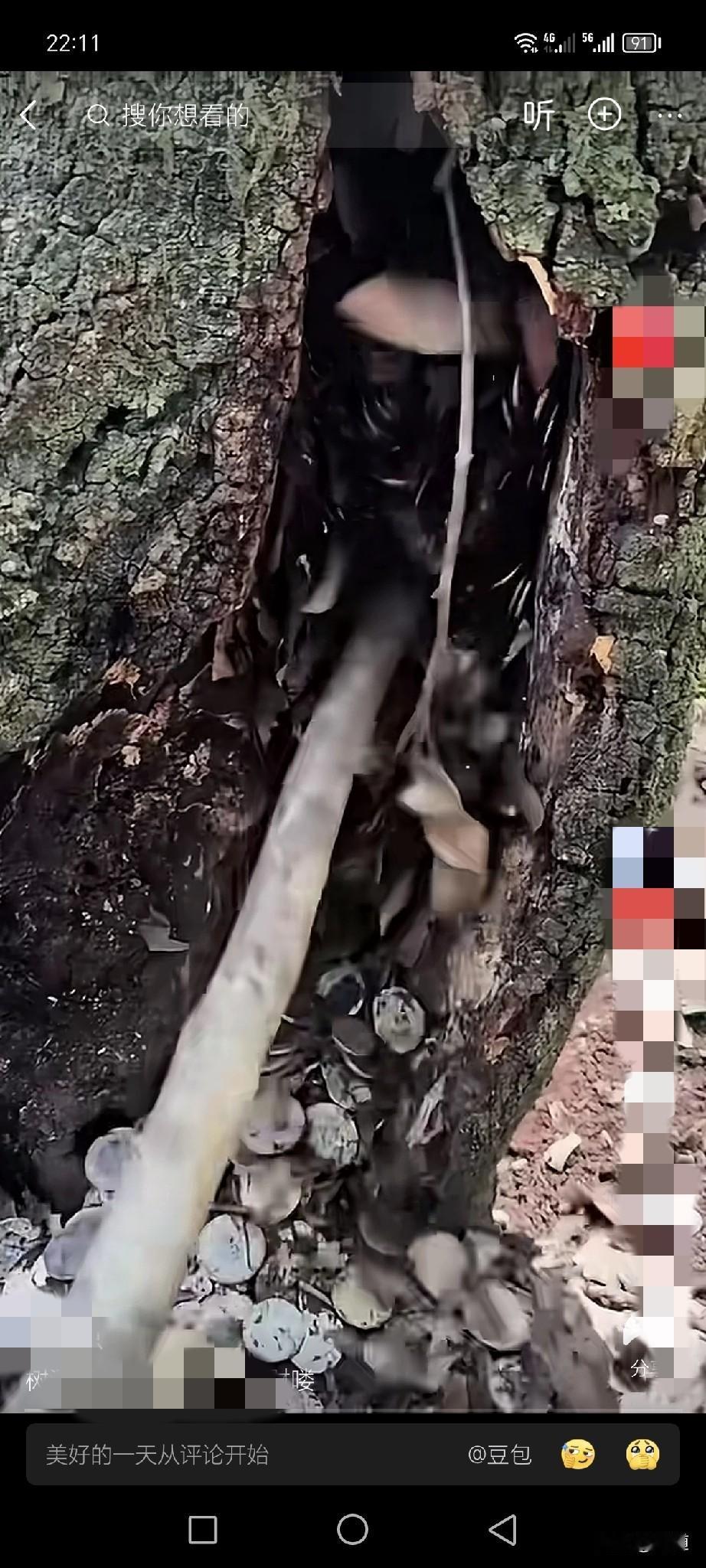 一男子在树洞里发现大量硬币,边拿树棍往外扒拉,边发出疑问,这是鸟叨的?还是谁藏的? 我认为这就是为了拍视频做的假,为流量也是拼了。
