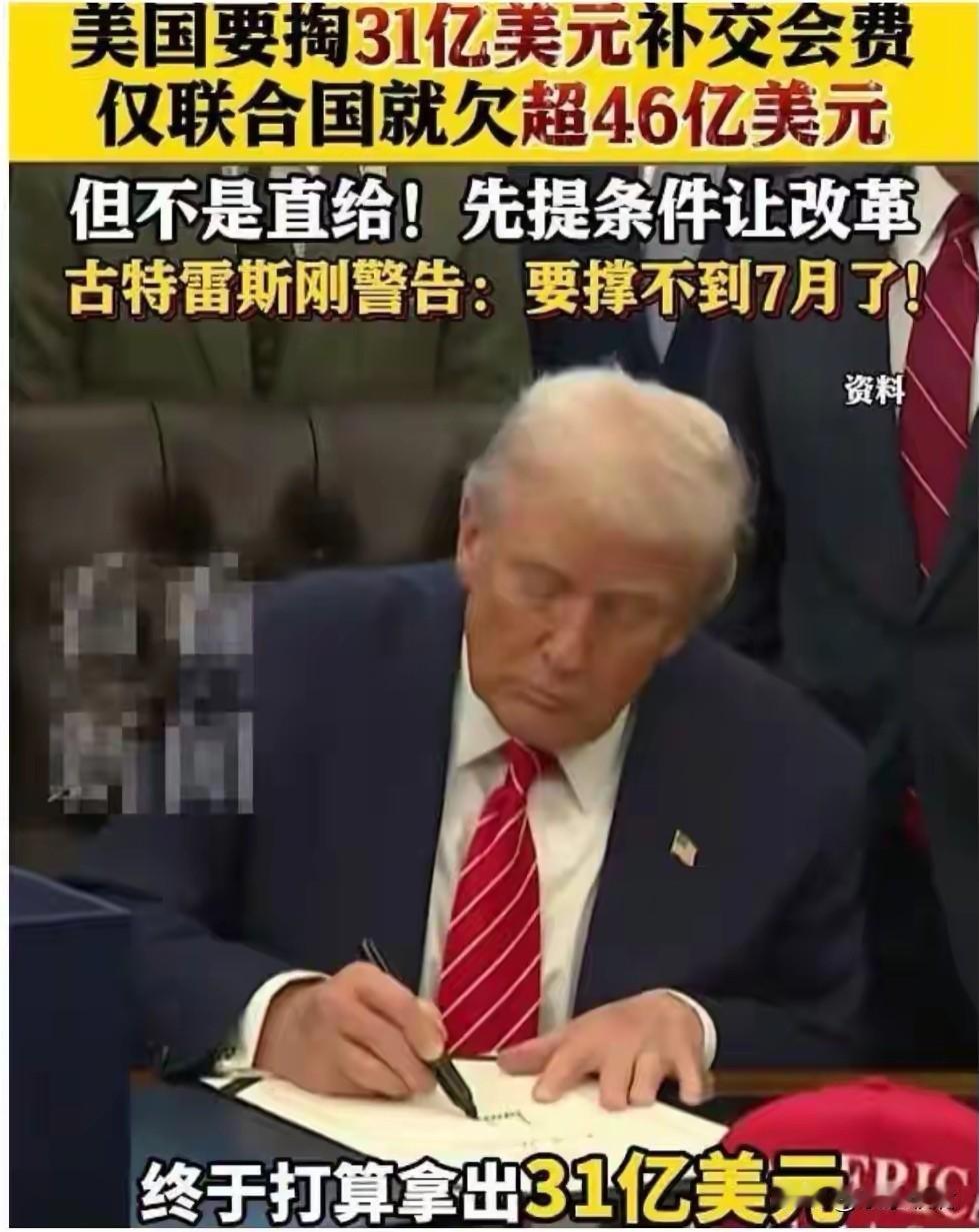 老美终于不想当老赖了!特朗普大笔一挥,同意补缴联合国欠款。世人皆知,老美是联合国最大的老赖,现在联合国资金链即将断裂,古特雷斯已经发出警告,再不缴钱,不但老美的表决权将取消,而且联合国机构也将从纽约迁移。看来,联合国的这种压力是实打实的,特朗普也是聪明人,好汉不吃眼前亏,同意补缴31亿美元,不过得分批付款,暂时先付了15亿,以后有没有变化,就看联合国能不能让特朗普高兴了。