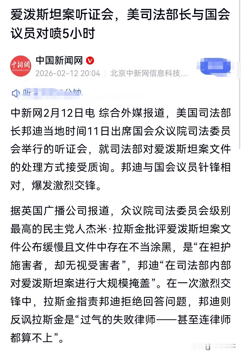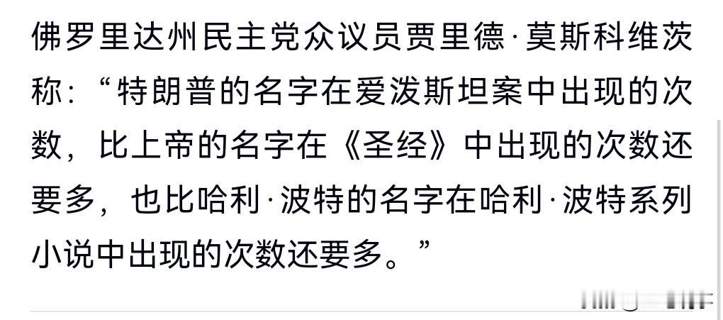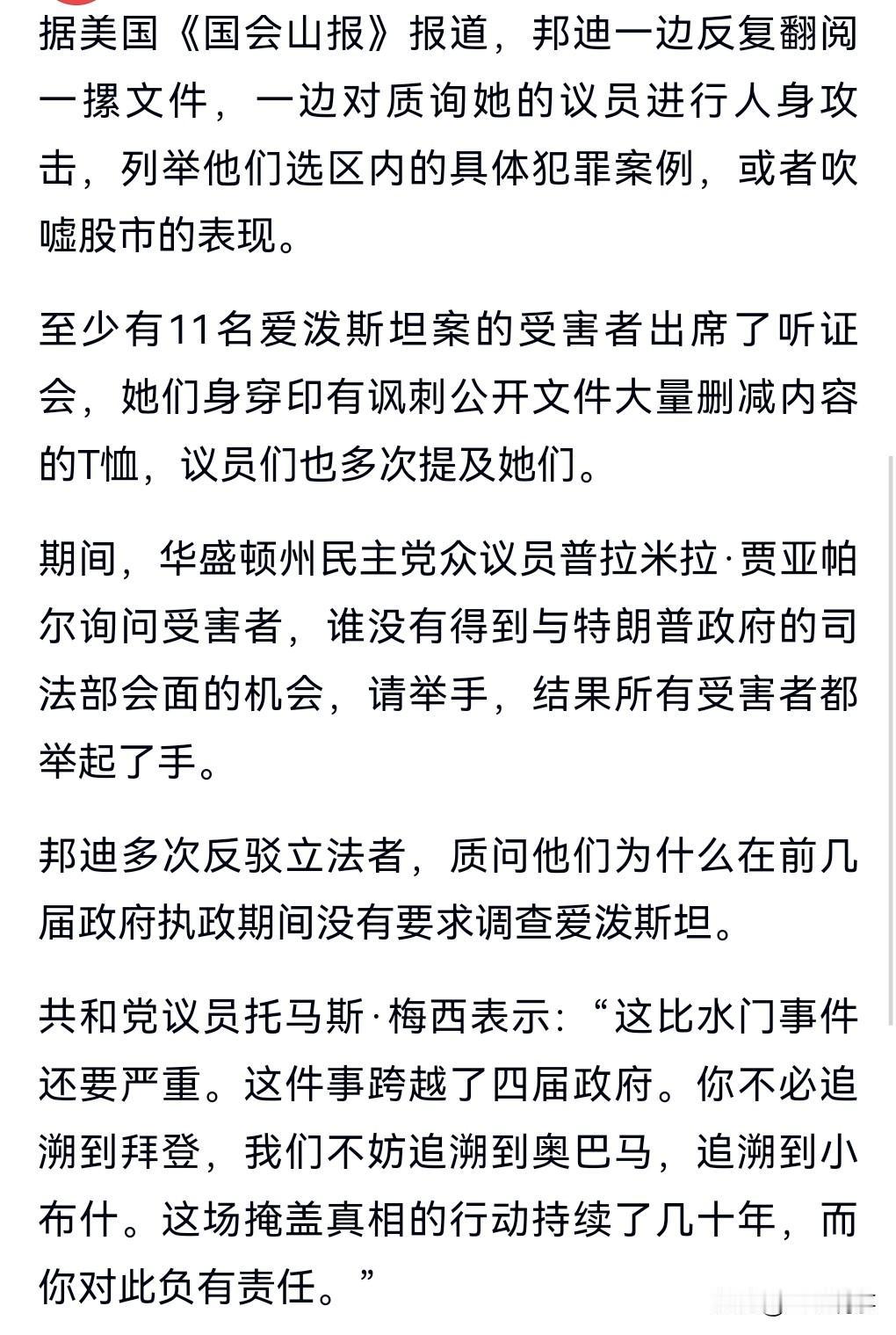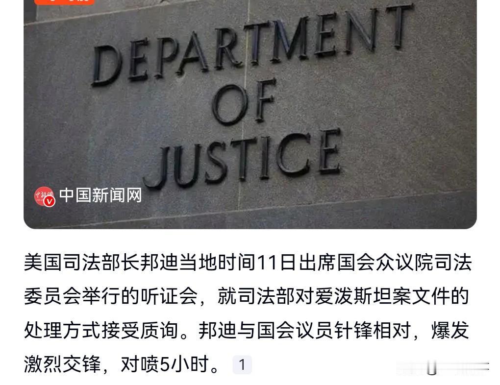 在美国司法部长是干什么吃的?竟然不敢直面质疑,只会和一些人互相嘲讽和针对。 当地时间11日,美司法部长与国会议员对喷5小时。 美国的政客到底在掩盖什么,也不好好的为爱泼斯坦案的受害者讨回公道,也不抓人。 特朗普在爱泼斯坦案文件中出现的次数多得惊人。 这美国司法部长给人的感觉非常的不专业。 根本和这个职位不匹配。 有人嘲讽特朗普在爱泼斯坦案的出现次数,比《圣经》中的上帝出现的还多,比哈利波特出现在哈利波特系列小说中的次数还多。 这个说法实在是太给力了。