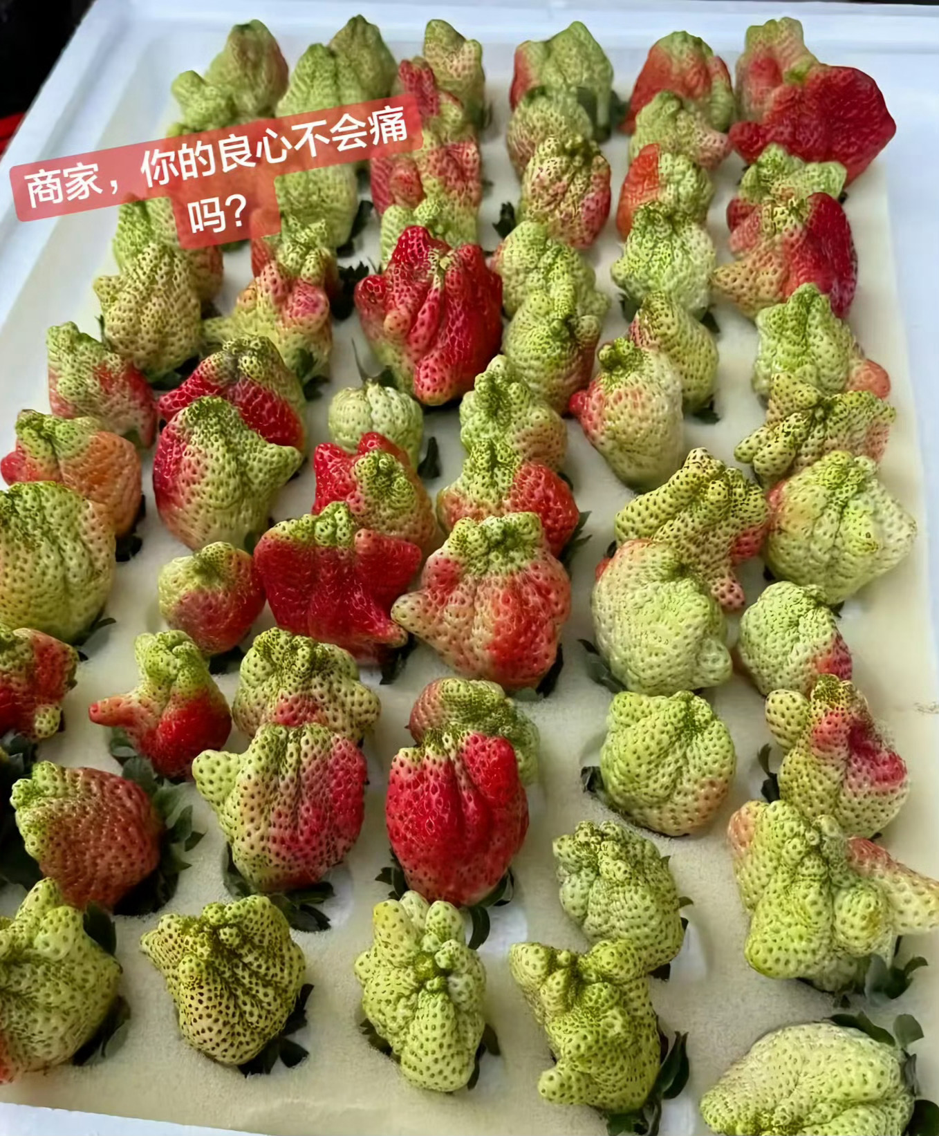 第一次看到一箱草莓毫无食欲 这草莓确实让人毫无食欲!这哪是草莓啊,叫“瘤子天团”一点都不为过。不好意思,我在吃的方面也是颜控。你们呢?