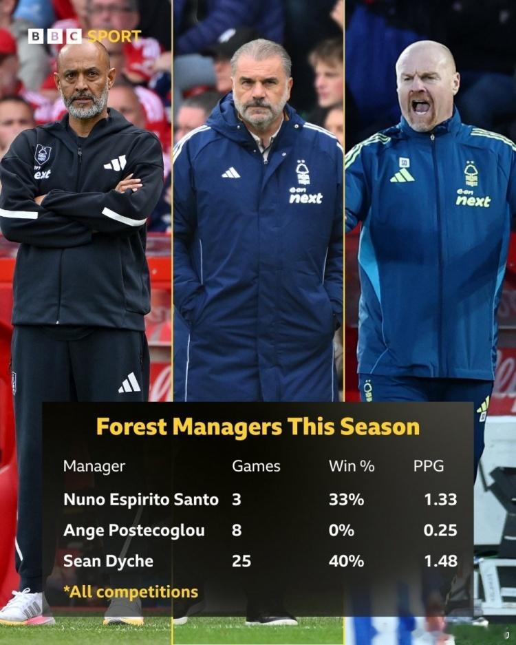 诺丁汉森林本赛季已经换过三名主帅,分别是努诺、波斯特科格鲁和戴奇,这家俱乐部有望创造历史,因为此前没有任何英超球队单赛季更换超过三名主帅。